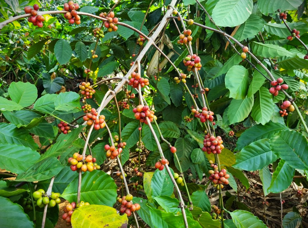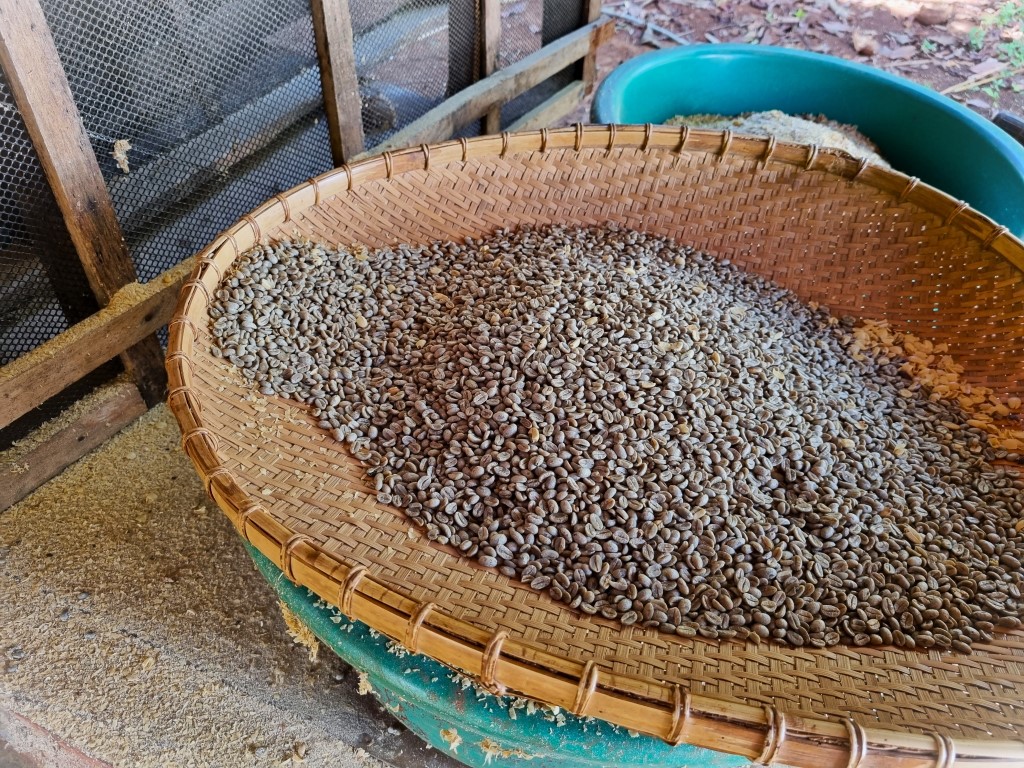 En kort resumé av mina inhämtade kunskaper om Mr. Viengs kaffeodling och jordbruk på Bolavenplatån: Han odlade tre arter av kaffe, för att sprida riskerna och för att de trivs på olika höjd över havet: Coffea arabica som har högst kvalitet men också är mest krävande, Coffea robusta med kraftigare smak och lämpad för espresso, Coffea liberica excelsa som har mindre smak men är mycket tålig, och växer som träd snarare än som buskar. Kaffeplantorna kan bli upp till 25 år innan de byts ut. Mr. Vieng visade oss processen från skörd till kaffe, som enligt honom tar minst två veckor: hur han skalar frukterna, torkar bönorna och rostar dem.