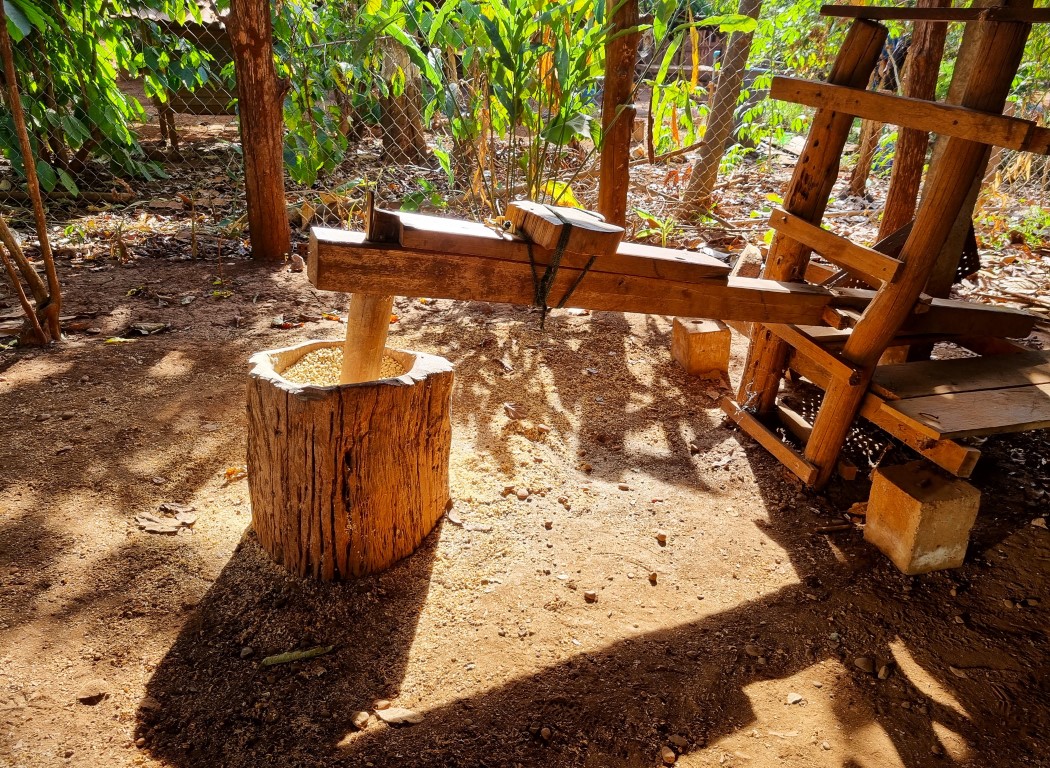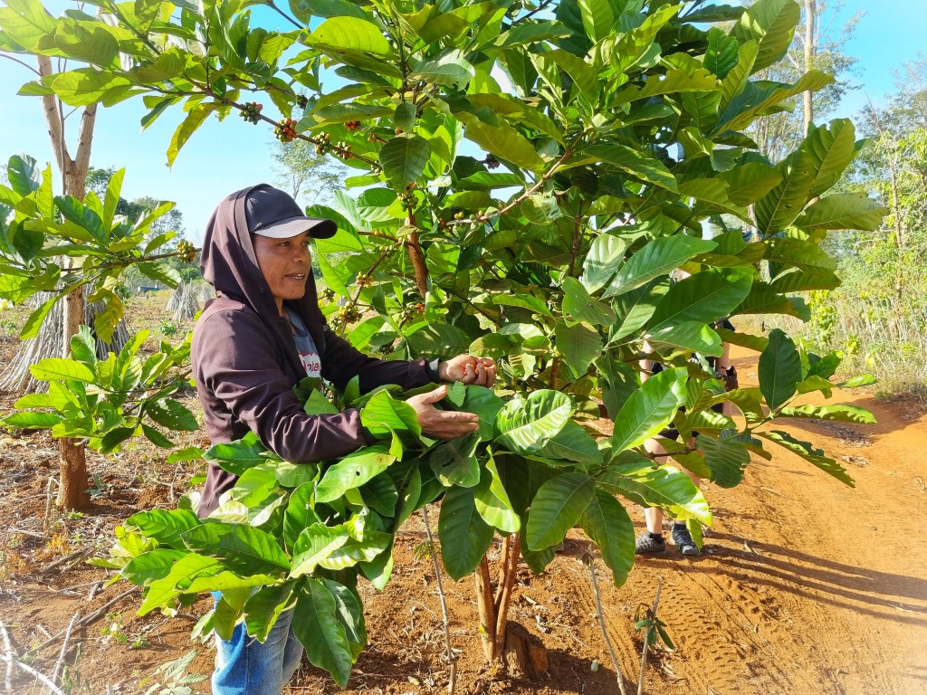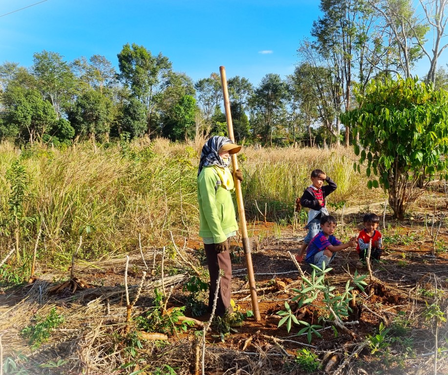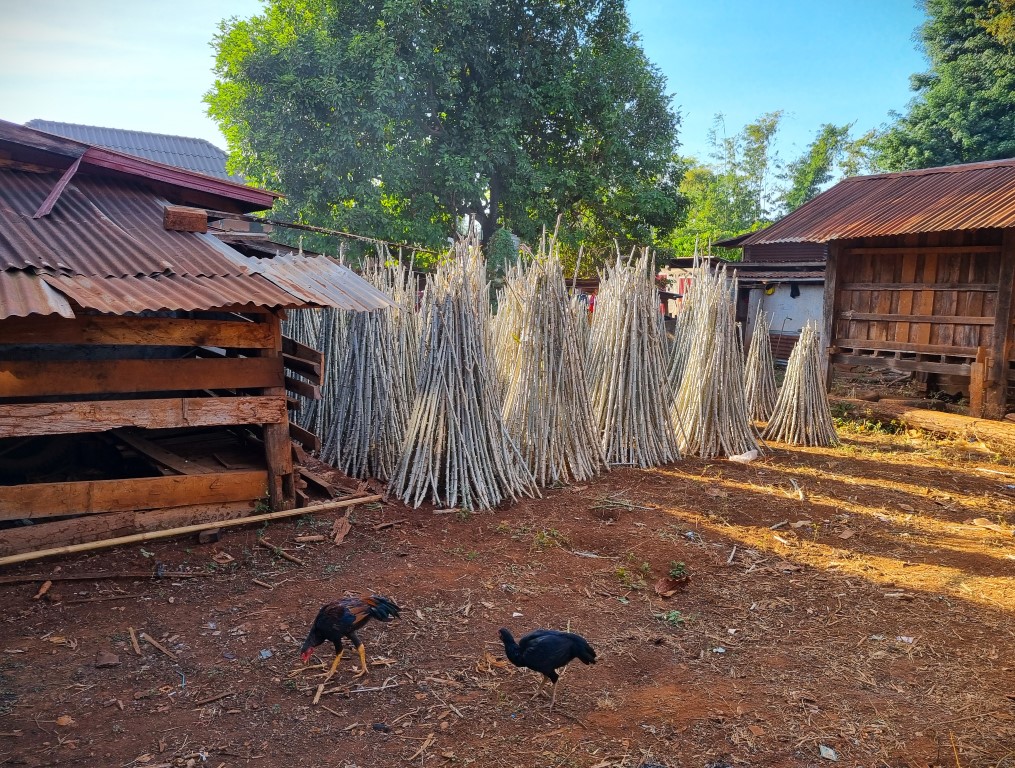 På gården odlas också mycket maniok (eller kassava), ett baslivsmedel i många länder. Här fick jag svaret på vad det var jag sett från bussfönstren i både Kambodja och Laos; de kupade raderna med buskiga växter, knippen av spön och skivade rötter på tork utmed vägarna. Maniok växer ungefär som en dahliaknöl, och en kvinna demonstrerade hur hon drog loss roten i den torra marken med en lång stång med krok som fungerade som en hävstång. Rötterna återanvänds inte som utsäde (som potatis eller dahlior) utan man klipper istället bitar av stjälkarna och sätter som sticklingar.