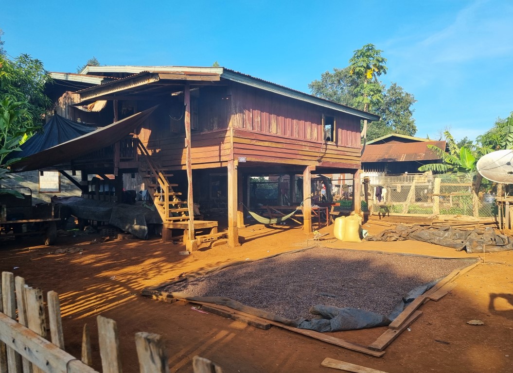 Det var också intressant att se hur Mr. Vieng samodlade på sin gård. Här växte kaffebuskar i en salig blandning med jordnöt, banan, ananas och papaya. Han berättade att ormar ibland gömmer sig bland bladen; svarta och bruna gick an men de gröna var svåra att se, och han väntade på att hitta en riktigt stor orm som han kunde stoppa ner i ett kärl med brännvin till ormsnaps. Efter denna information höll vi behörigt avstånd till alla buskar! I en buske hittade han ett myrbo bland bladen, som han mosade till lite lätt och sedan bjöd oss att smaka. Lätt syrligt, sa de som nappade på erbjudandet. Sist på rundan passerade vi hans bostadshus, traditionellt byggt på pålar, där kaffebönor och maniok låg på tork.