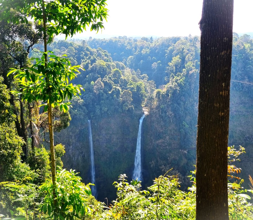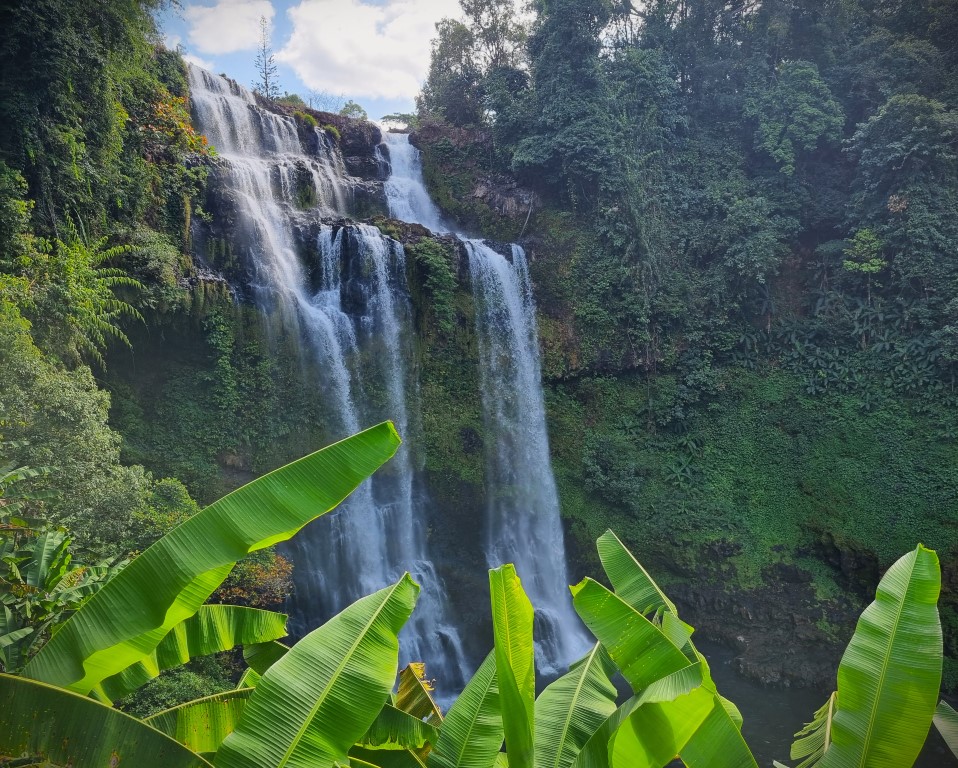 Vi gjorde första stoppet knappt fyra mil österut, vid vattenfallet Tad Fane (Tad betyder helt enkelt vattenfall så det blir lite tårta på tårta att säga så, men med allas våra begränsade kunskaper i laotiska så är det bäst att vara tydlig). Det här är ett tvillingfall: två vattendrag som kastar sig utför ett stup som är 120 meter högt, och de bildar därmed Laos högsta vattenfall.