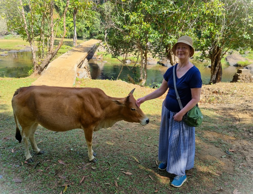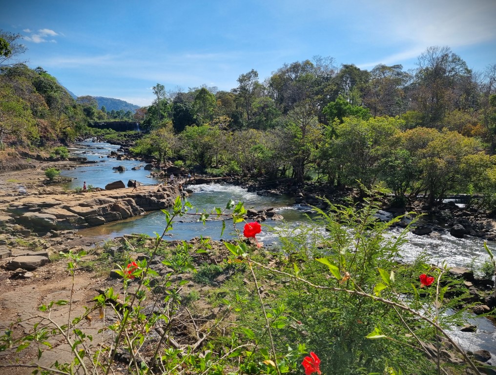 Uppe på höjden ovanför fallet rann strömmen fram i en stillsammare idyll. Här fanns sittbänkar, små vandringsstigar och en bro över till andra sidan vattnet, där ett gäng mildögda kor och kalvar tagit siesta. På tillbakavägen genom turistområdet passerade vi fyra vackra kvinnor i färgglada dräkter med en korg bredvid, för frivillig dricks om man ville fotografera. I Laos finns många etniska grupper, enligt Wikipedia 47 huvudetniciteter med 149 undergrupper. Flera av grupperna bor i olika byar på platån, men vilken dessa damer tillhörde vet jag inte.