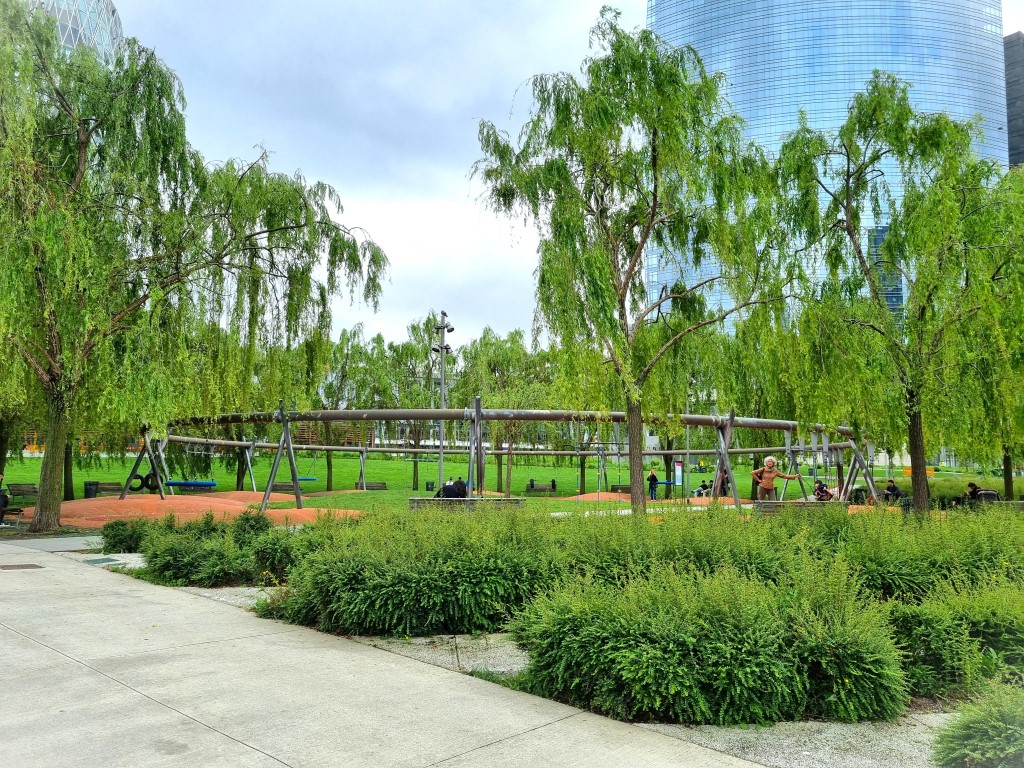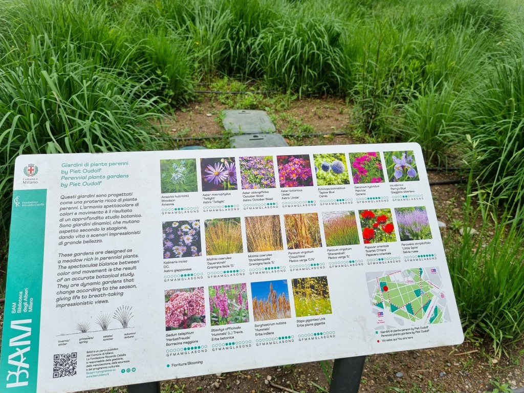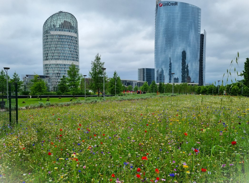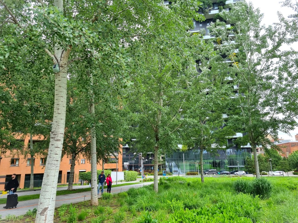 Ja, jag kände ju ingen för att ringa på och ta en fika, men jag beskådade husen grundligt från utsidan och var nöjd med det. Framför husen fanns ett nytt parkområde med blommande äng, lekpark, sittplatser, hundrastgård, träddungar och en perennplantering utformad av den holländske landskapsarkitekten Piet Oudolf. Ett rimligt och ganska lyckat försök att förankra Bosco Verticale i marken istället för att låta husen växa upp ur en asfalterad yta.