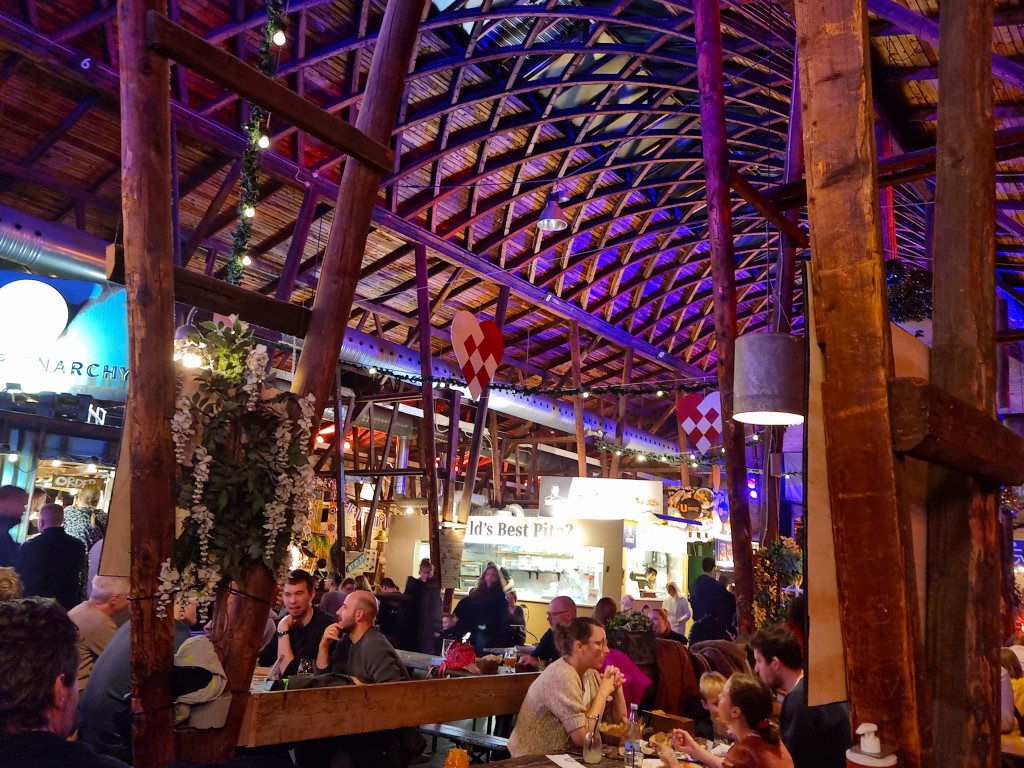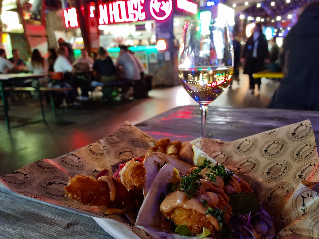 Jag blev alldeles nipprig av av lycka över så många valmöjligheter, och åt kvällsmat där båda kvällarna. Första kvällen vietnamesiska vårrullar med dipp samt en shandy med flädersmak och andra kvällen seafood tacos och ett glas vin. Före hemresan på söndagen tittade jag förbi vid 11-tiden, och då pågick en klädloppis, ett pysselevent och ett föredrag i lokalerna, plus att det samtidigt gick att få sig en bit mat. Superhäftigt ställe!
