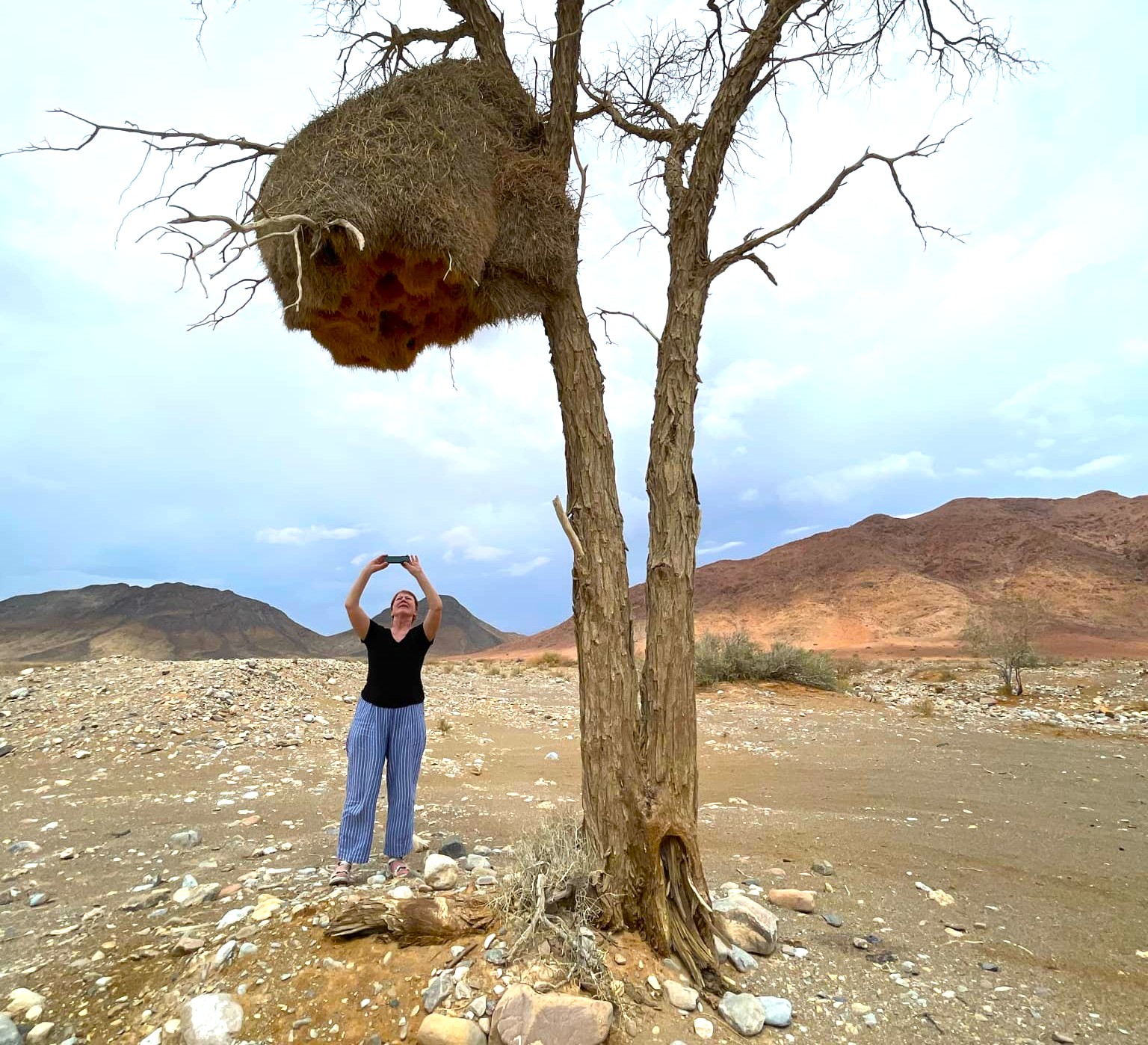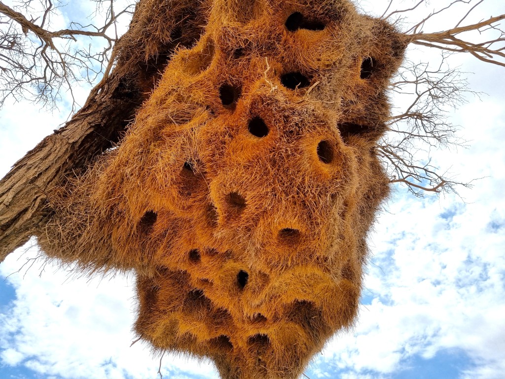 Under vår resa ser vi en del djur från bilen: först en flock rosa flamingos nära kusten och Valvis Bay, sedan strutsar, en flock med apor, någon oryx och zebra, men det blir inga bra bilder från bilfönstret. Vid ett gigantiskt fågelbo däremot går vi ut och fotograferar. ”Social weavers”, kolonivävare på svenska. Vilket jobb, att bygga ett flerfamiljshus! Invånarna har lämnat byggnaden, eller har de måhända bara tagit siesta?