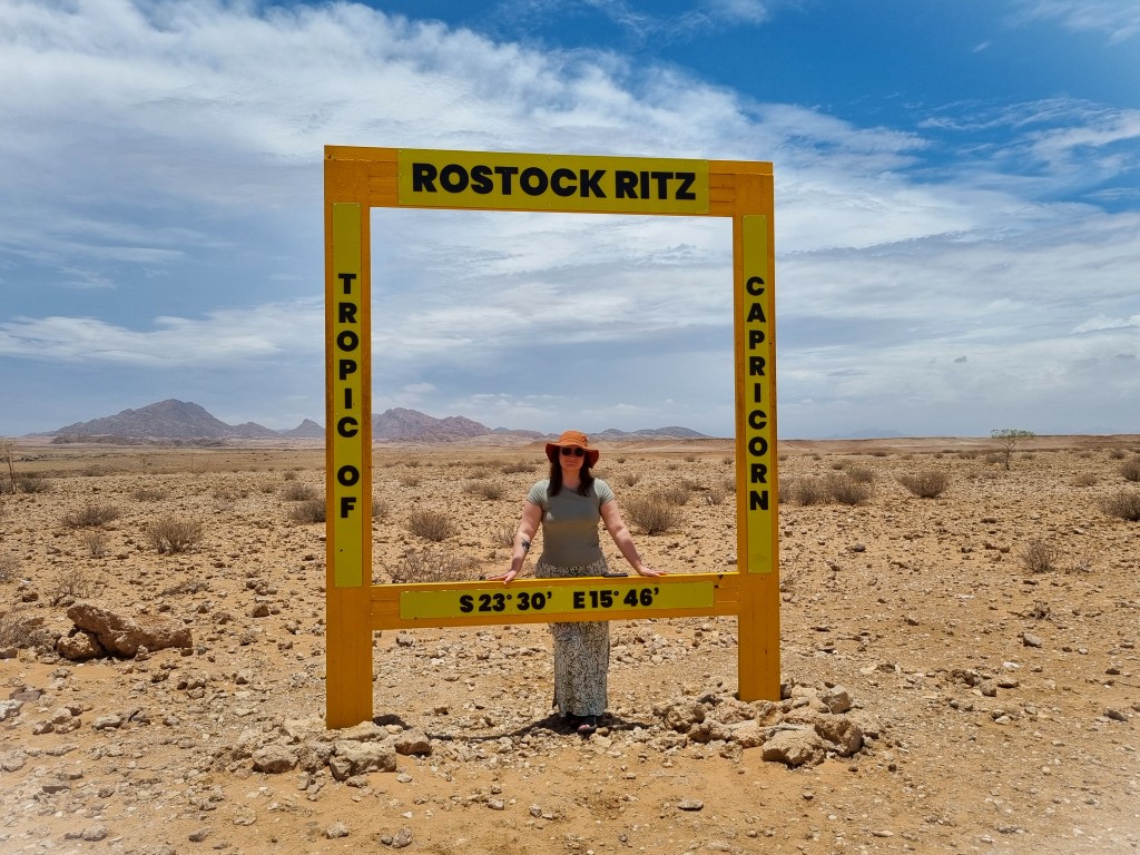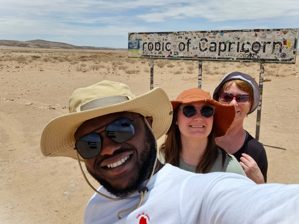 Efter ytterligare många mil kommer vi fram till Stenbockens vändkrets, en sådan där konstig sevärdhet som inte syns utan bara finns där. Det är ändå skönt att sträcka på benen lite, ta några foton och selfies, och sedan lika skönt att komma in i svalkan i en luftkonditionerad bil igen.