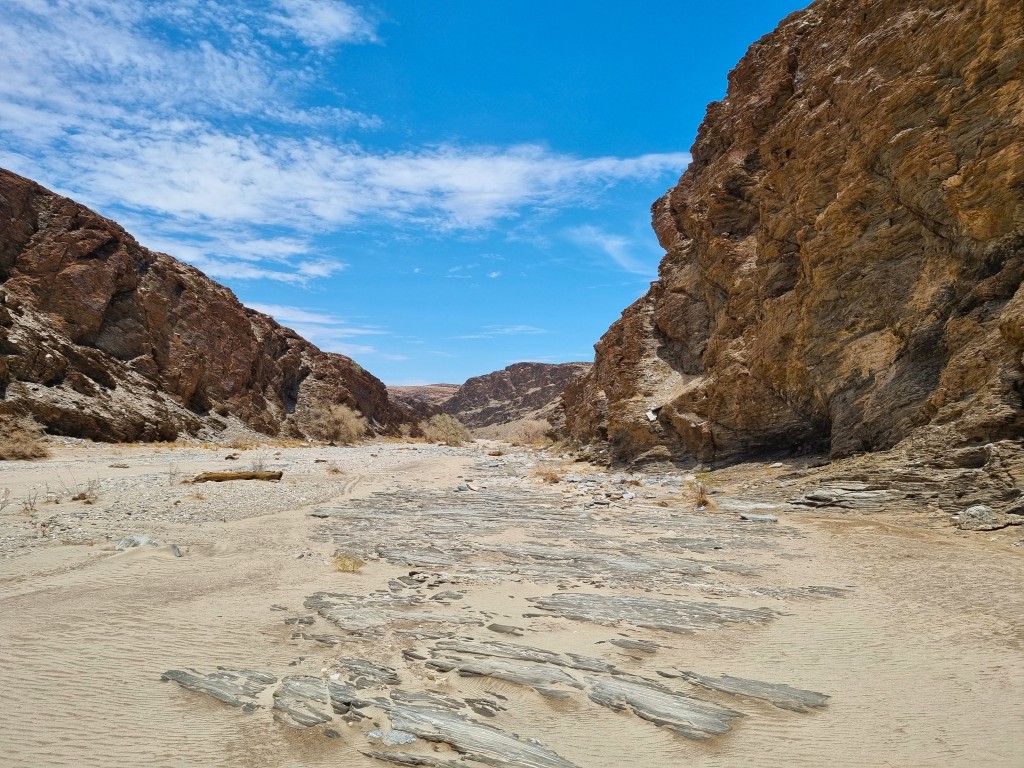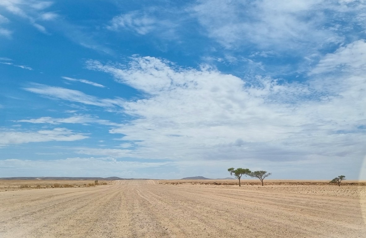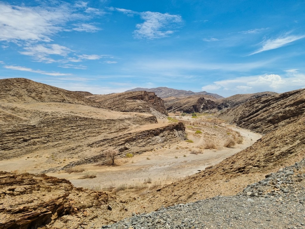 Efter drygt femton mil och strax utanför nationalparkens gränser passerar vi Kuisebpasset på 905 meter över havet, med en bro över floden Kuiseb: för tillfället och som oftast helt torrlagd.