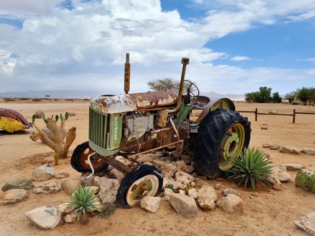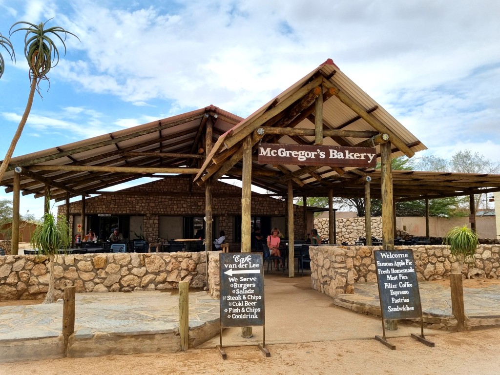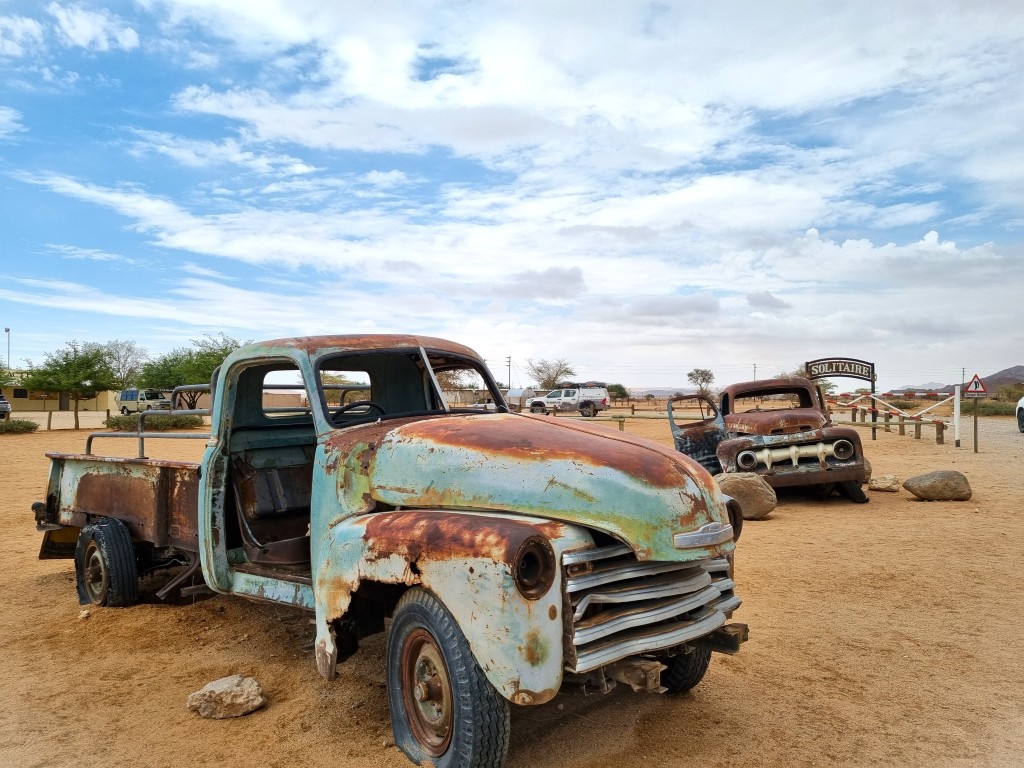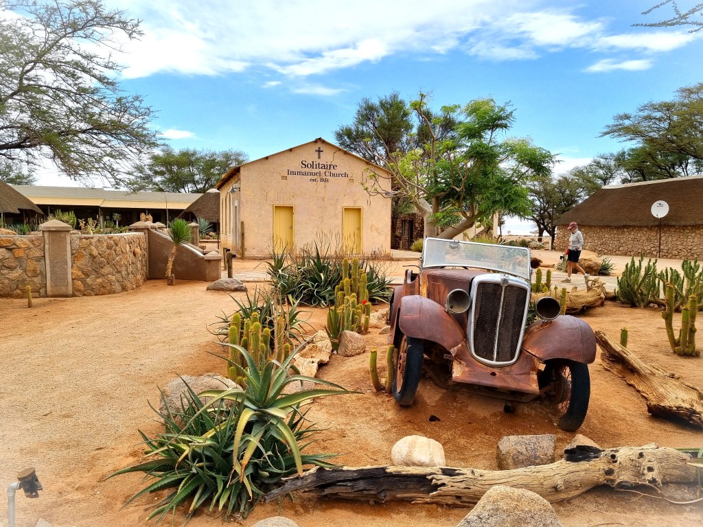 Vårt längsta stopp görs i Solitaire, en plats där alla förbipasserande stannar. Alla. Här finns nämligen den första bensinstationen sedan Swakopmund, och det första stället där man kan få sig något att äta samt besöka en riktig toalett. Bosättningen med den strategiska placeringen grundades 1948, och har numera minst två caféer, ett kapell, en däckverkstad och en lodge med boendemöjligheter.