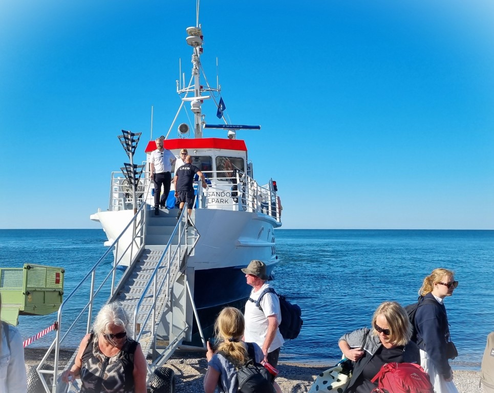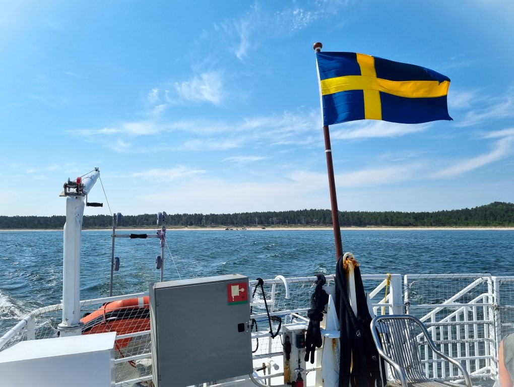 Båtresan bokas via Sandöresor. Båten avgår från Nynäshamn eller Fårösund och bokningen omges av de förbehåll som jag upplevt vid tidigare besök på nationalparksöarna Blå Jungfrun och Djurö: vid riktigt dåligt väder kan resan bli inställd. Lyckan är stor när jag inser att jag dragit en vinstlott för tredje gången i rad. Jag reser från Nynäshamn vid två-tiden, solen skiner från klarblå himmel och vinden är måttlig. Efter den brutala åksjukan under min busstur från Laos till Vietnam i januari i år har jag dock fått ett återfall av illamåendefobi; jag har fullt upp med att undvika tanken på att bli sjösjuk, och sitter ute på däck och stirrar stint på horisonten. Min ryggsäck lastas in i bagageutrymmet när vi bordar båten, och där i ligger solkrämen. Jag klarar mig undan sjösjuka, men blir däremot rejält bränd på näsan – nåväl, man kan inte lyckas med allt…