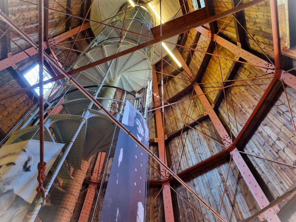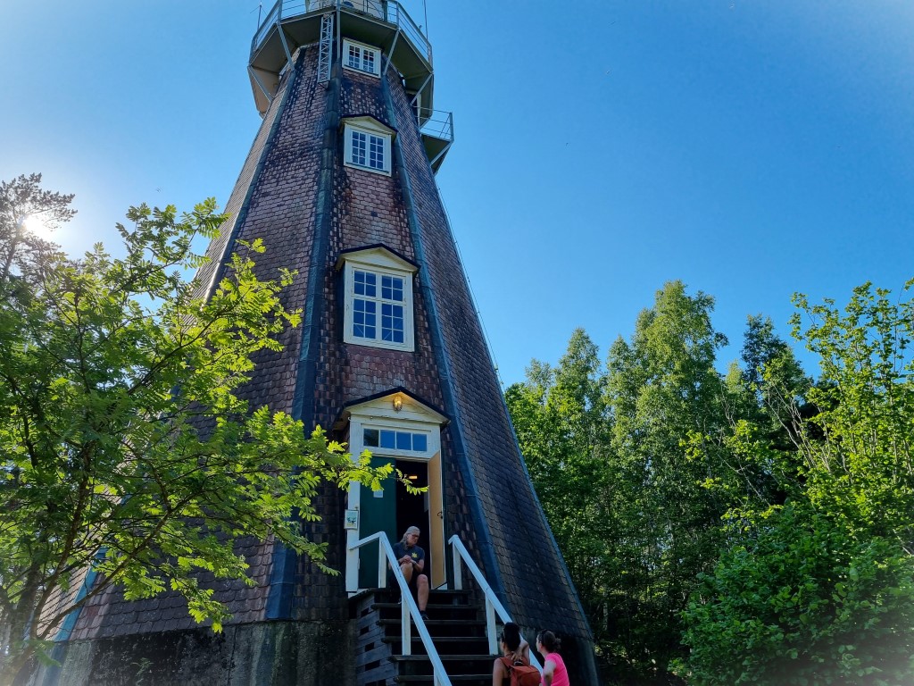 Efter en liten siesta i lägret är jag redo för dagens visning av fyren. Lotten guidar oss med entusiasm – det hon kallar sina gamla lärartakter. Hon ger en liten föreläsning om öns historia i allmänhet och fyrens i synnerhet, mycket intressant. Fyren invigdes 1859 och konstruktör var Nils Gustaf von Heidenstam, far till nationalskalden Verner von Heidenstam. Fyrtornet är fortfarande i bruk, det är 24 meter högt och förankrat i sanddynerna på en kulle 18 meter över havet. Vi får gå upp för den smala spiraltrappan och se ön från ovan; väldigt mycket tallskog må jag säga, med en sandremsa runt omkring.