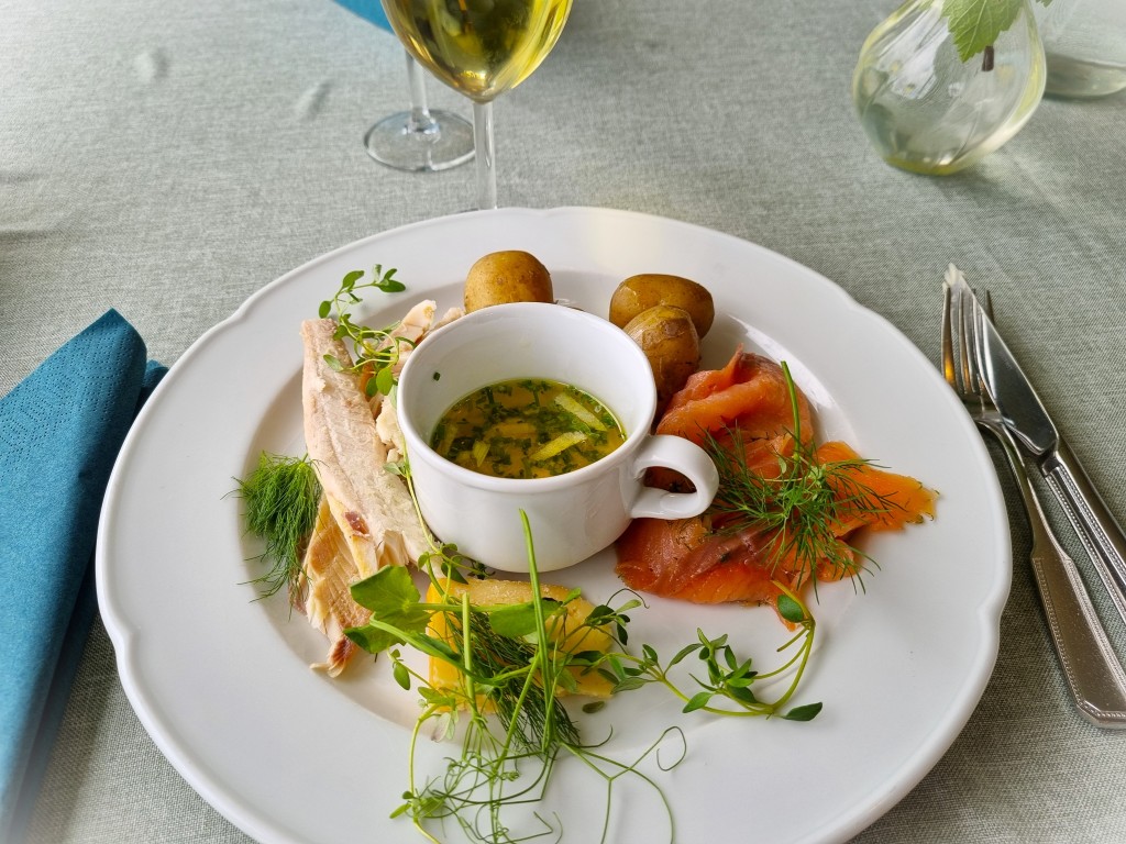 Efter att ha tittat över området är det dags för ännu en höjdpunkt på programmet: mat på restaurangen. Ett alternativ är buffé, men jag har spanat in à la carte-menyn i förväg och fastnat för den tornedalska specialiteten Dopp i kopp. I koppen simmar smält smör med örter och hackad lök, och där i doppas färskpotatis, rökt sik och rökt lax. Till detta en rejäl bit västerbottensost. Det är utsökt, och jag uppskattar särskilt att fisken är lättrökt – jag gillar inte när maten osar som av brandrök. På vägen ut genom receptionen passar jag på att köpa en pirog med rökt sik, så är kvällsmaten fixad också.