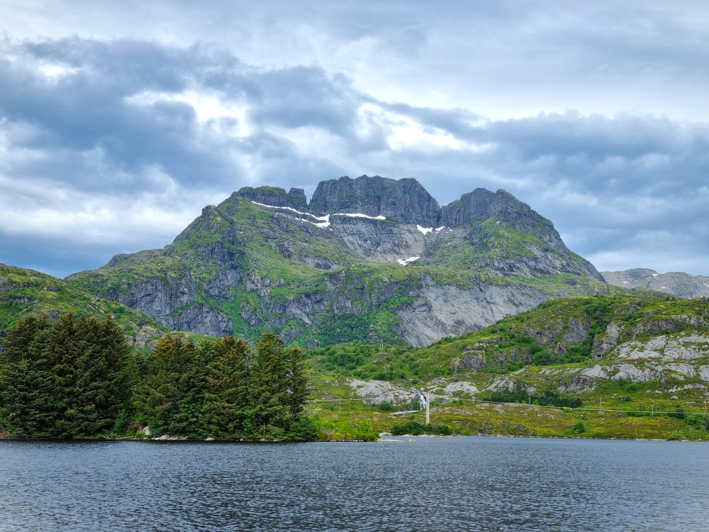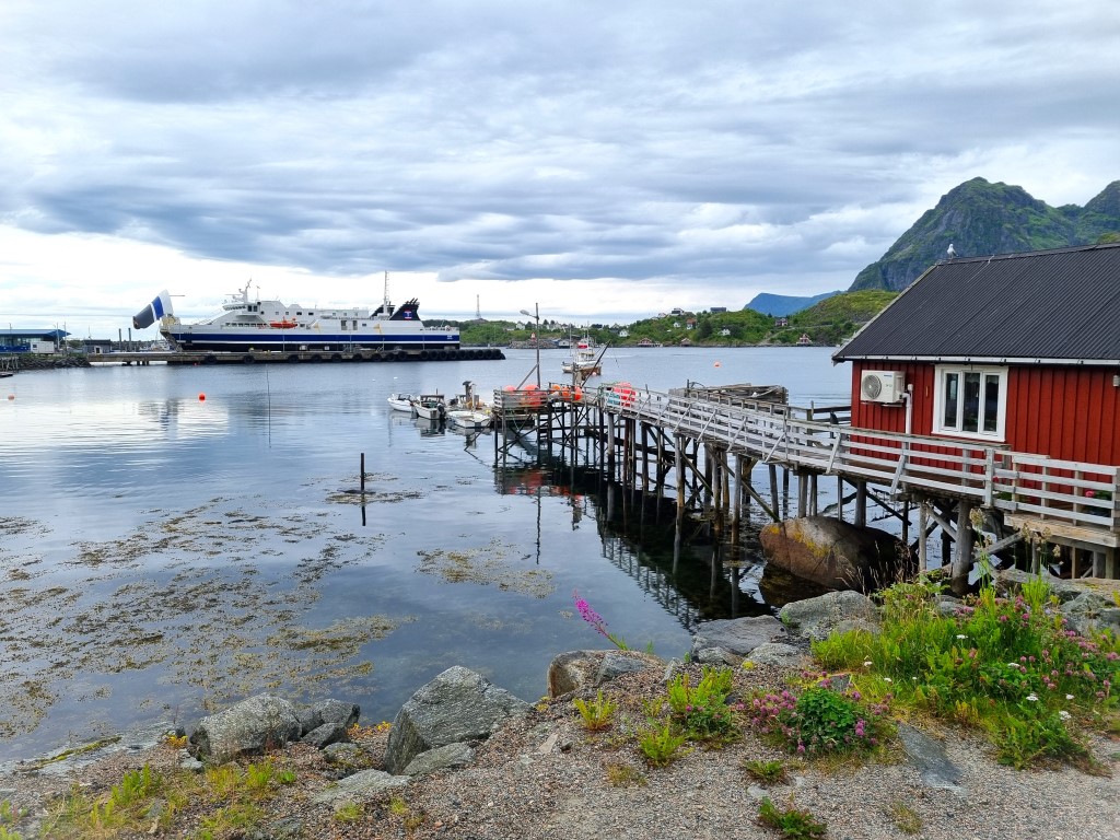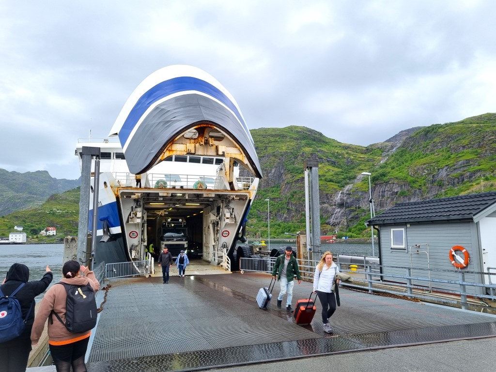 Min tågresa gick upp genom Norge på Nordlandsbanen, och färjan från Bodø över till Moskenes kändes som det naturliga alternativet. Jag kollade upp ruteplanen för färjebolaget Torghatten, och satsade på avgången klockan 7 på morgonen. Och gissa vad!? Det var GRATIS! Det kostar för fordon men fotgängare åker gratis, det enda kravet är att registrera sig via en QR-kod vid färjeläget. Så de vet vilka som är på färjan ifall något händer, var en tanke som susade förbi. Färjeturen tog tre och en halv timme och tuffade på mycket stabilt, med gott om sittplatser och ett café där man kunde köpa kaffe och tilltugg.