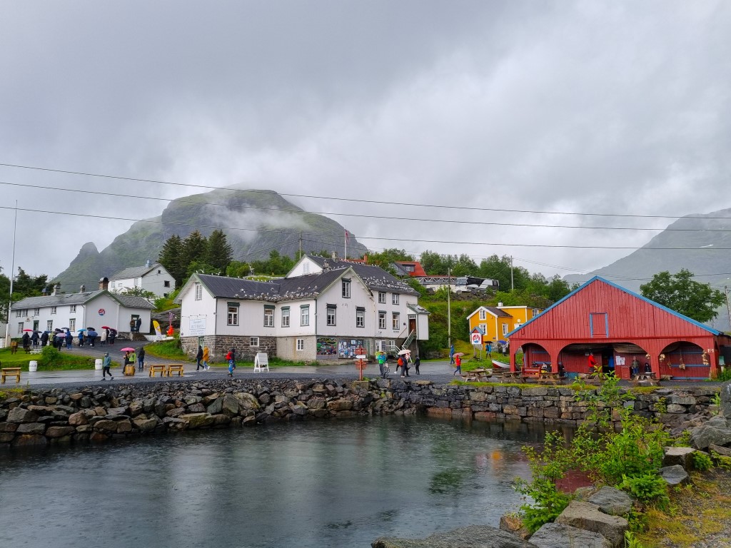 Norsk fiskeværsmuseum i Å visade hur ett typiskt fiskeläge i Lofoten såg ut förr, enligt uppgift mellan cirka 1840 och 1960, med husmansstuga, båthus, postkontor, trankokeri, bageri och smedja. Det lilla caféet erbjöd kaffe och nybakta kanelbullar, och jag delade bord med ett par från Italien som i all denna kylslagna exotism höll fast vid vanan att dricka varsin minimal espresso. Jag betalade inträdesbiljetten på 120 NOK, och vandrade runt i friluftsmuseet som hade en och annan informationsskylt men inga guider. Det var ganska välbesökt en dag som denna, när vädret påbjöd museibesök snarare än vandringar och toppbestigningar. Jag traskade tillbaka till Sørvågen, hängde kläderna på tork och vilade en stund innan dagen avslutades med en fantastisk middag på restaurang Havet, i hotellet The Tide.