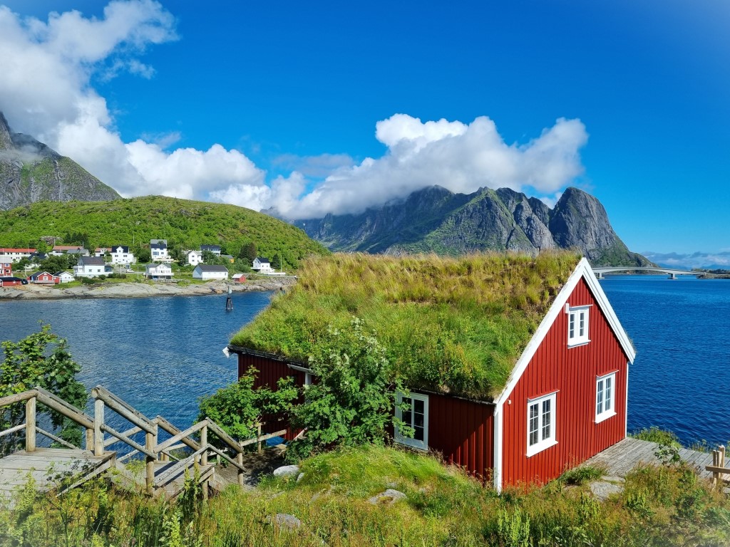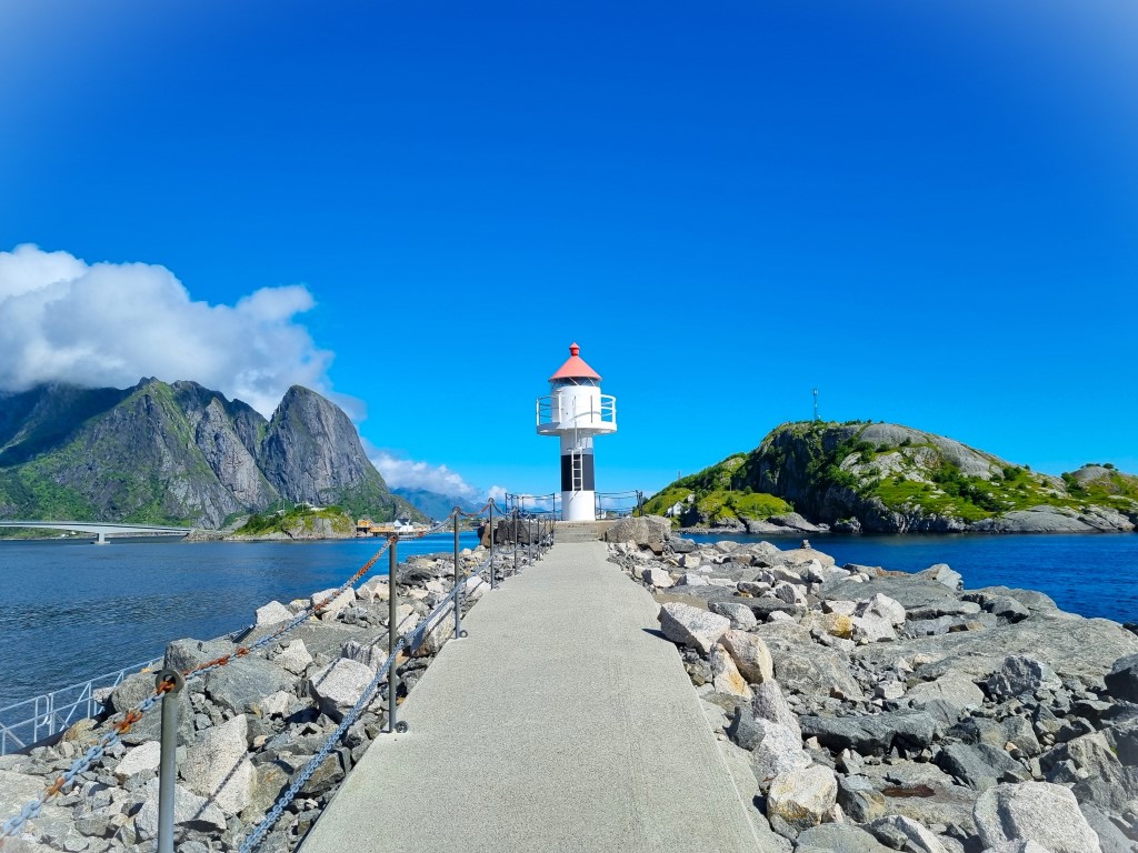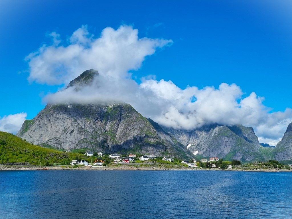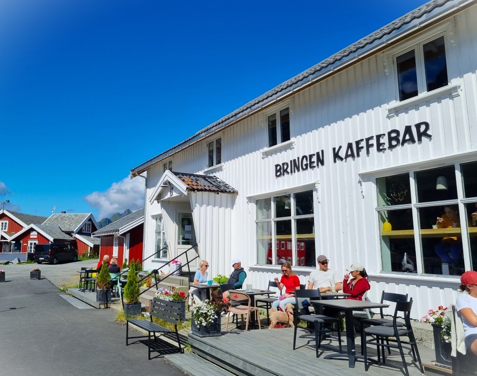 Reine hade helt klart en högre puls och fler turister än Sørvågen; en stor ställplats för husbilar, kajakuthyrning och souvenirbutik. Bringen kaffebar erbjöd uteservering i solväggen och smaskiga mackor med ägg och lax. Över Reine reste sig Reinebringen 448 meter över havet, en topp som erbjuder en vidunderlig utsikt över Reine med omgivningar. Jag hade bara två timmar på plats och dessutom all packning med så någon toppbestigning var inte att tänka på: mina eventuella kraftansträngningar kräver utöver viljan också god tillgång på tid. Det var häftigt ändå att läsa att Norge tagit hjälp av arbetslag med sherpas från Nepal för att bygga stentrappor upp till toppen; inte bara här utan på flera ställen i Norge, för att göra stigarna något säkrare och för att minska slitaget på naturen.