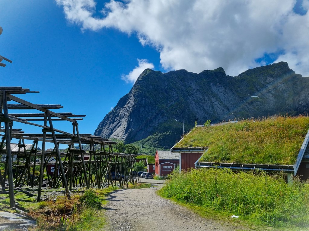 Under min enda heldag på plats i Lofoten regnade det från morgon till kväll, med skiftande intensitet. Jag klädde mig efter väder och gick till byn Å, tre kilometer söderut och vägs ände vad gäller Europaväg 10. Regnjackan höll emot bra, men från knäna och neråt blev jag sjöblöt och det kippade mellan tårna efter ett tag. ”Ut på tur, aldri sur” – ja, jag kände mig ändå glad och belåten med att vara ute på tur och äventyr! Jag hade dålig koll på vad som väntade i Å, kartan visade några markerade utsiktspunkter men sikten var minimal, och så något slags museum och café; det lät bättre.