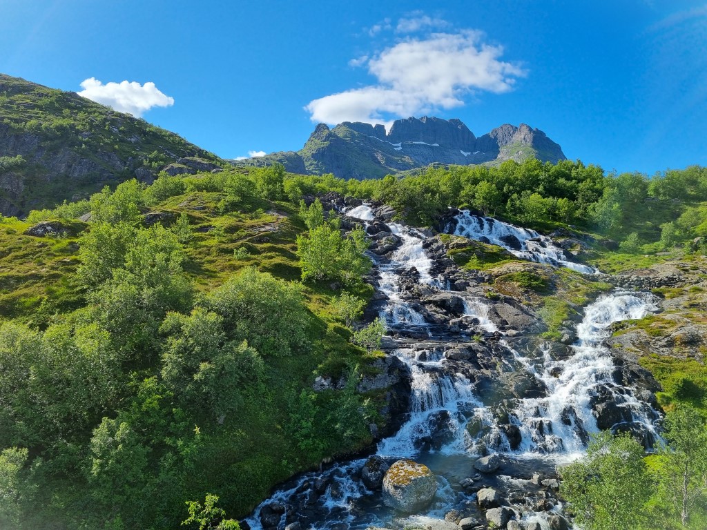 Efter tolvslaget på ankomstdagen sken solen från blå himmel. Jag började med lunch på Maren Anna, checkade sedan in på rummet, ställde av mig ryggsäcken och gav mig ut för att utforska lite natur. Det fanns en promenadväg runt den lilla sjön Sørvågsvatnet på 2,5 kilometer vilket var väl kort, så jag vandrade vidare upp för höjderna och förlängde turen med några kilometer utmed forsande vattendrag och frodiga fjällängar.