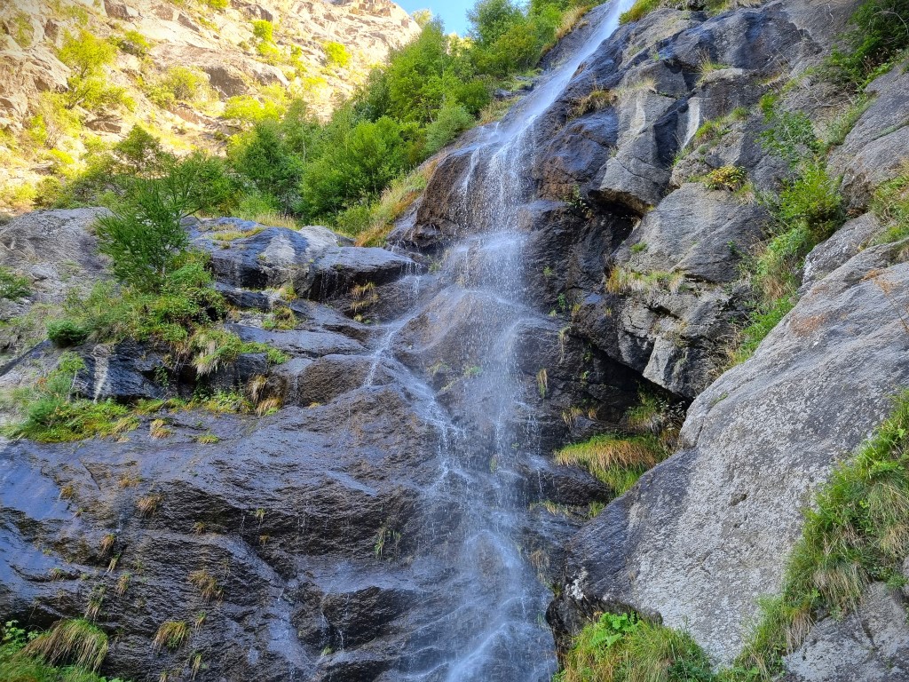 Efter frukosten traskade vi iväg i den ljumna sensommarmorgonen, där solen steg på en klarblå himmel. Jag var fylld av tillförsikt. Dagens sträcka såg ut att bli betydligt lättare än gårdagens, med endast 395 meters stigning sammanlagt. Den här dagen rörde vi oss verkligen mitt i jordbrukslandskapet, utmed bergsmassivets sydsida. Några kortare sträckor gick på asfalterad bilväg, långa sträckor gick på gräsbevuxna stigar och traktorvägar från gård till gård, och emellanåt skulle vi brant ner i en skogbevuxen dalgång och lika brant upp igen. Över ”Tusenstegsravinen” hade det tack och lov byggts en hängbro med svaj i spannet. Jag fascinerades av de branta och välfriserade åkrarna där det uppenbarligen skördats gräs. Hur gick det till? De var så branta att jag skulle ha problem att ens gå på dem.