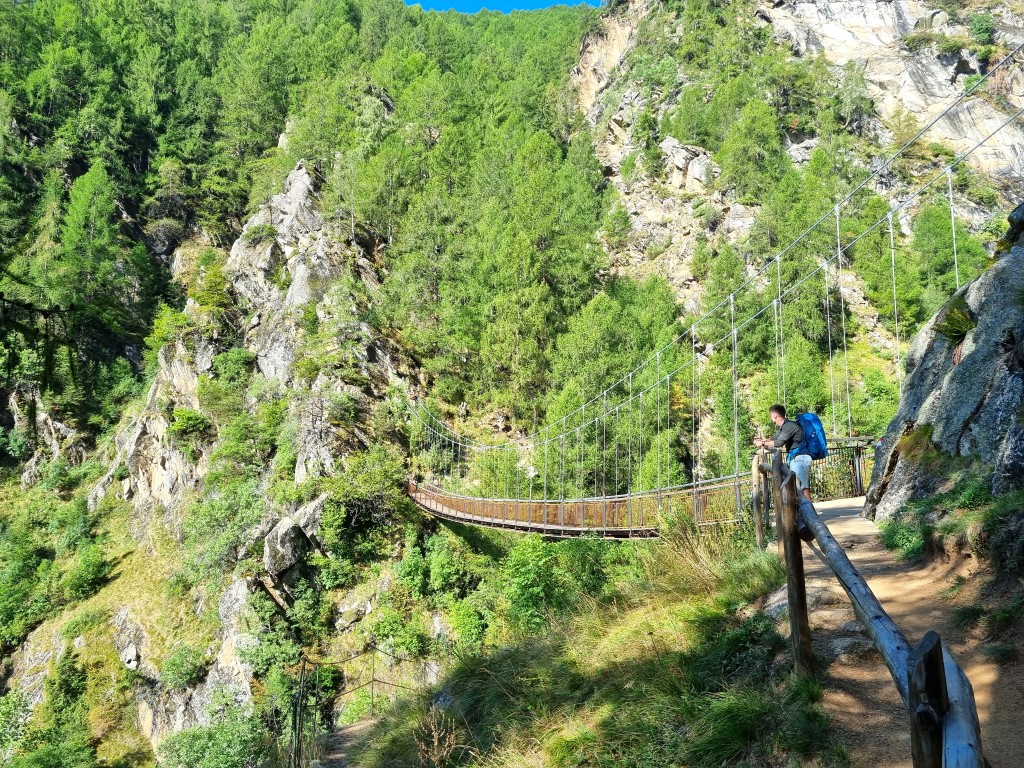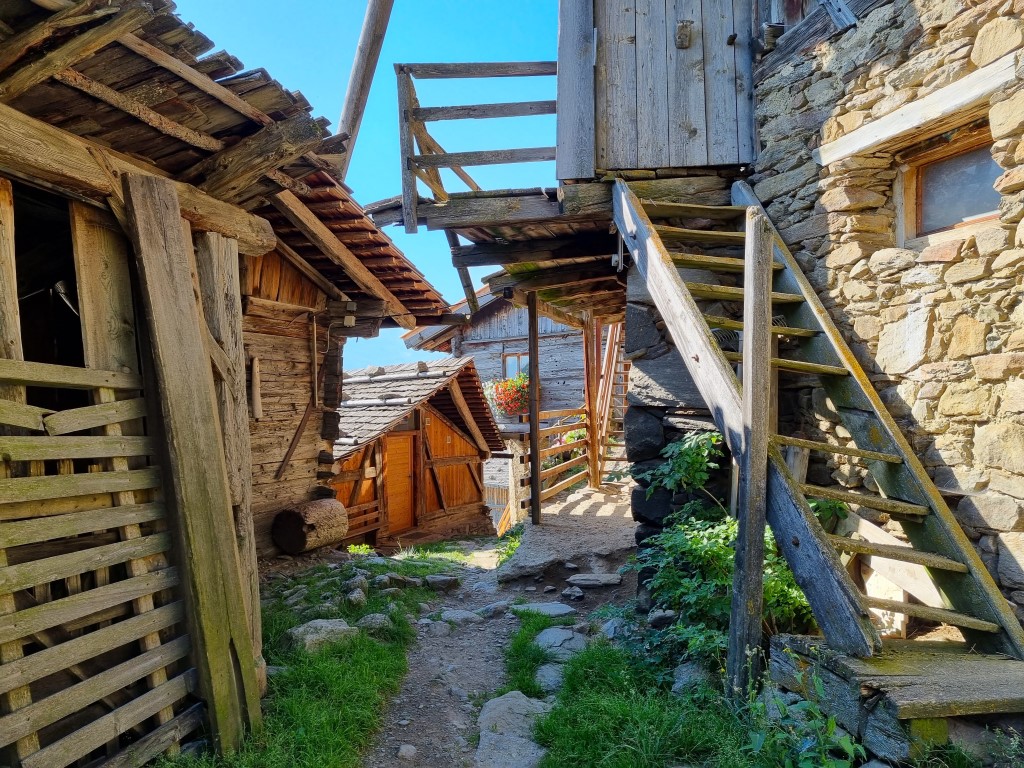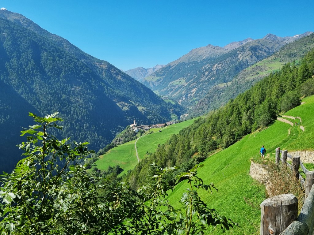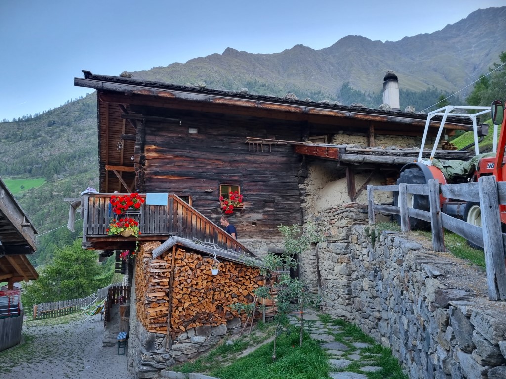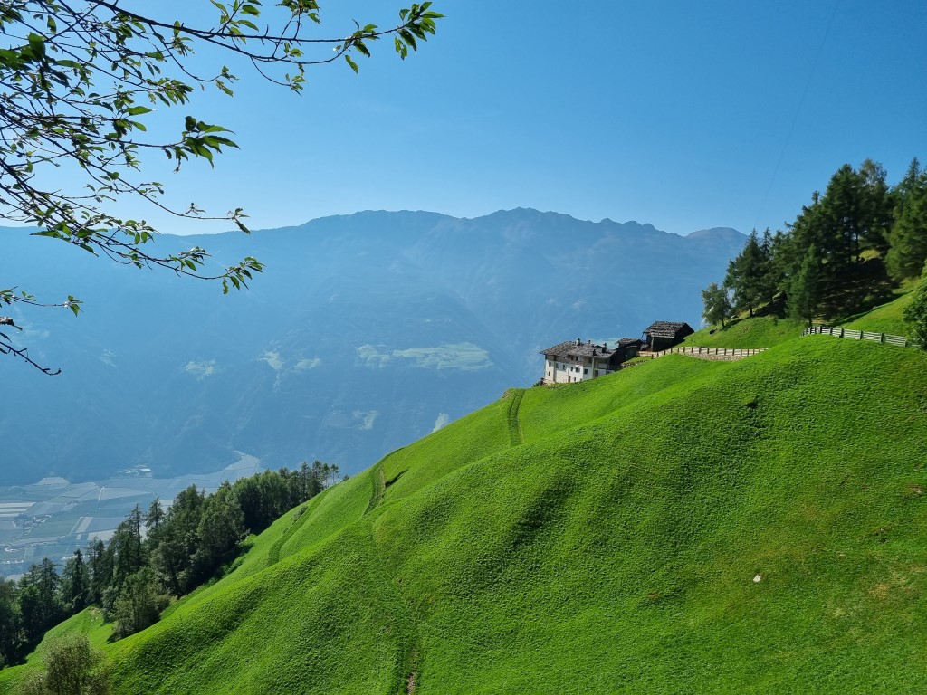 Untervernatschhof på höjden ovanför Katharinaberg är en bondgård och ett ”all inclusive-boende”, där middag ingår i priset 60 euro. Vi visades till vårt rum med lågt till tak, mörk träinredning och två små fönster. Gården hade enligt uppgift anor från 1200-talet, huset vi bodde i var i vissa delar från 1500-talet, men vårt sovrum hade nog ändå renoverats någon gång för hundra år sedan och toaletter och dusch i korridoren var faktiskt sprillans nya! Här var hela familjen engagerade; från farmor åttio plus som lagade maten till barnbarnet på runt tio år som bar ut grytorna med soppa och kött-och-potäter. Vi var tolv gäster, och Anke som var tyska men behärskade engelska hade kommenderats till vårt bord för att vi skulle ha någon att prata med. Vi hade mycket trevligt, och med hennes hjälp kunde jag fråga bonden hur de bar sig åt för att skörda de branta slänterna. Jag stöttade upp min fråga med lite pantomim och vevade i luften: med lie? Han skakade på huvudet och visade istället hur han höll en motordriven slåttermaskin framför sig, med en bredd på cirka tre meter. Kvällen avslutades ute på ”balkongen” med ett glas vin och utsikt över solnedgången och de blånande bergen, och jag orkade hålla mig uppe ända till klockan nio. Dagens sträcka var 18,3 kilometer och troligen mer än 395 höjdmeter, jag tror att vi knaprade på tredje dagens meter också beroende på vårt val av övernattningsställe.