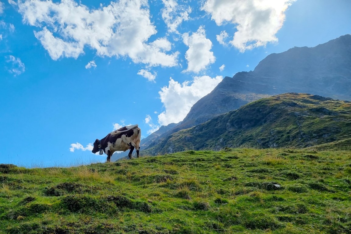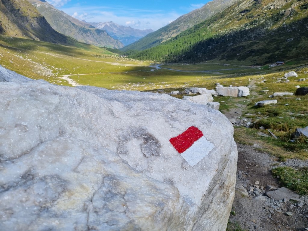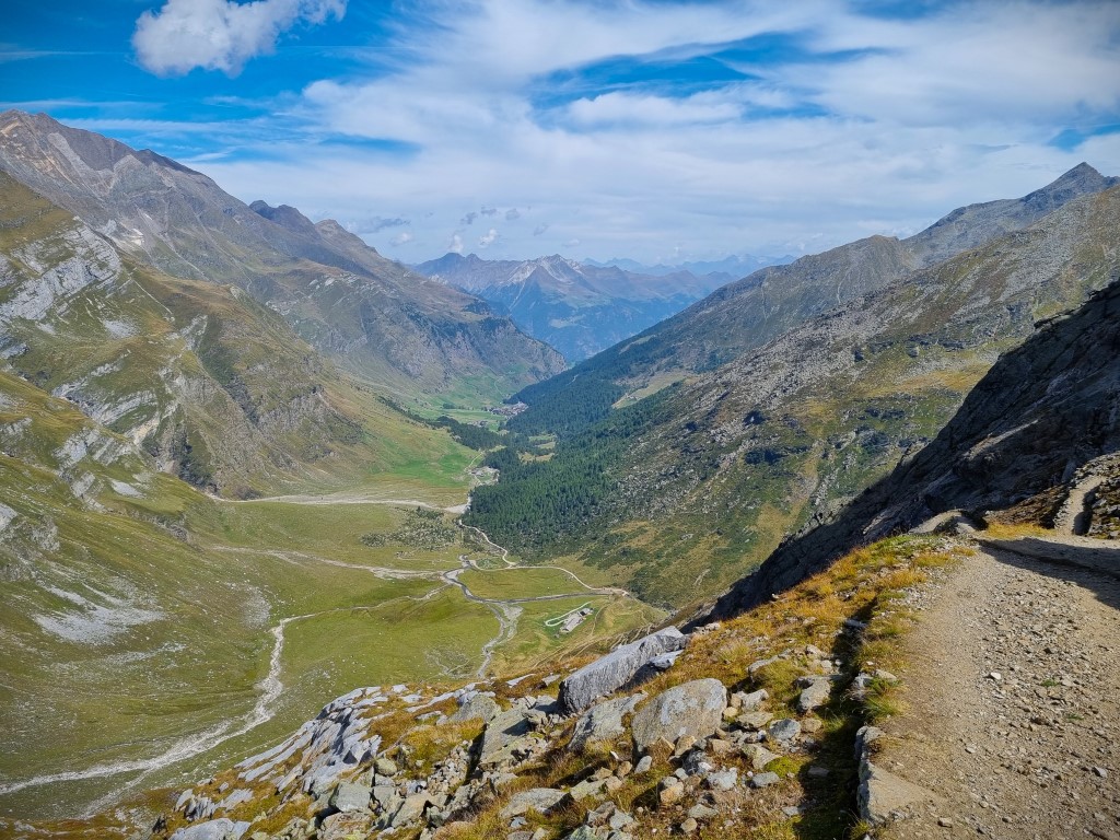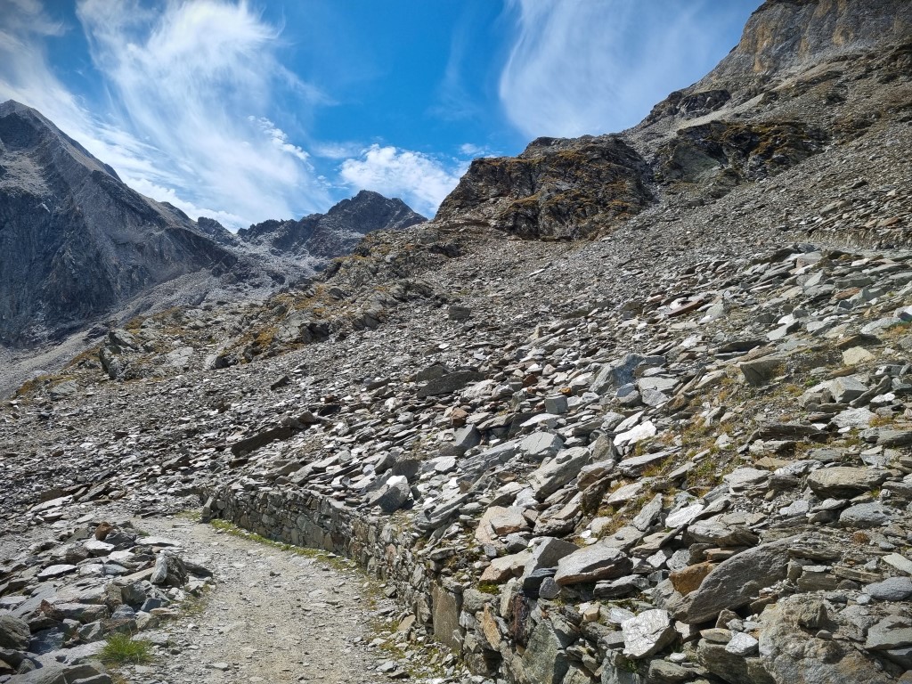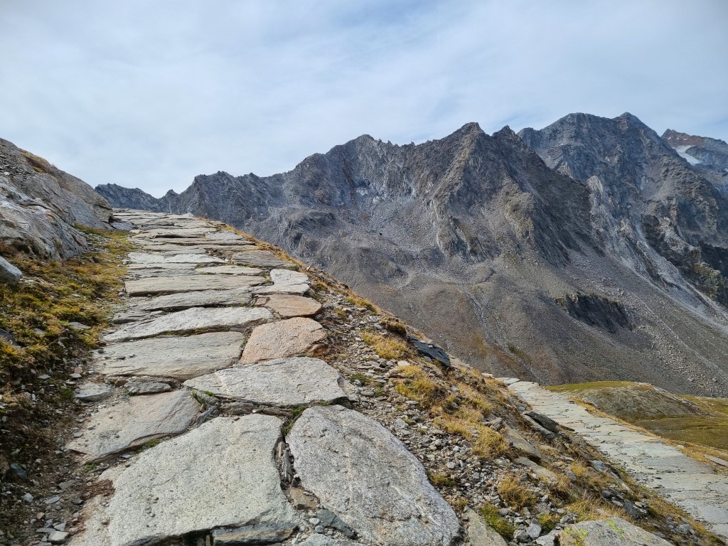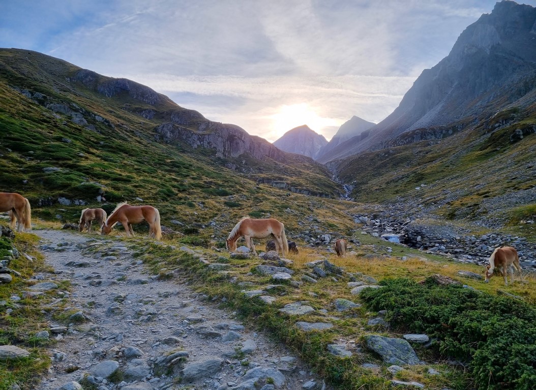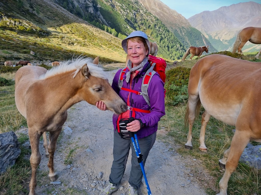Vi gav oss iväg med sikte mot de vackra ljusa bergstopparna vi hade beskådat under gårdagen. Oavbrutet uppåt, först grusad stig i moderata stigningar som senare övergick till en stenlagd stig som kryssade sig upp för bergssidan i skarpa kurvor. För varje böj med efterföljande raksträcka kom en ny, och en ny, och en ny. Jag testade ett nytt mentalt angreppssätt på den till synes oändliga uppförsbacken; att bara titta neråt på steget framför mig och låtsas att jag snart var framme. På så sätt höll jag på att gå rakt in i en flock med vackra Haflinger-hästar. De vuxna hästarna hade sett vandrare förr och var mer intresserade av att beta, men ett föl var nyfiket och lät sig klappas en stund.