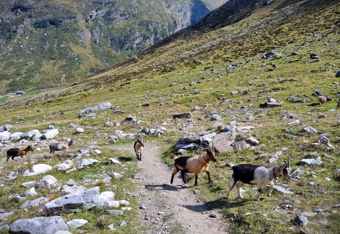 Så var det dags att ta sig nerför berget, in i nästa dal: Pfelderertal. Samma slingrande sicksack fast nedåt. Det kan tyckas lättare men är i själva verket mer ansträngande för benen, speciellt som de stabila stenplattorna försvann och stigen istället var fylld av löst stenskravel. Två gånger gjorde jag en osnygg hasande nedgång på vänster knä med höger fotled böjd under mig, sedan drog jag ner tempot och kände mig noggrant för i varje steg. Byn vi skulle till syntes borta i dalen, men det var långt och det tog tid. Sonen tröttnade på det låga tempot och drog iväg, men jag höll fast vid säkerheten framför allt; jag njöt av det vackra vädret, träffade på en sällskaplig katt och mötte en ung getherde som ledde en stor flock getter på bete.