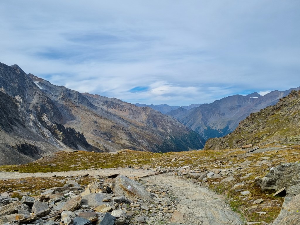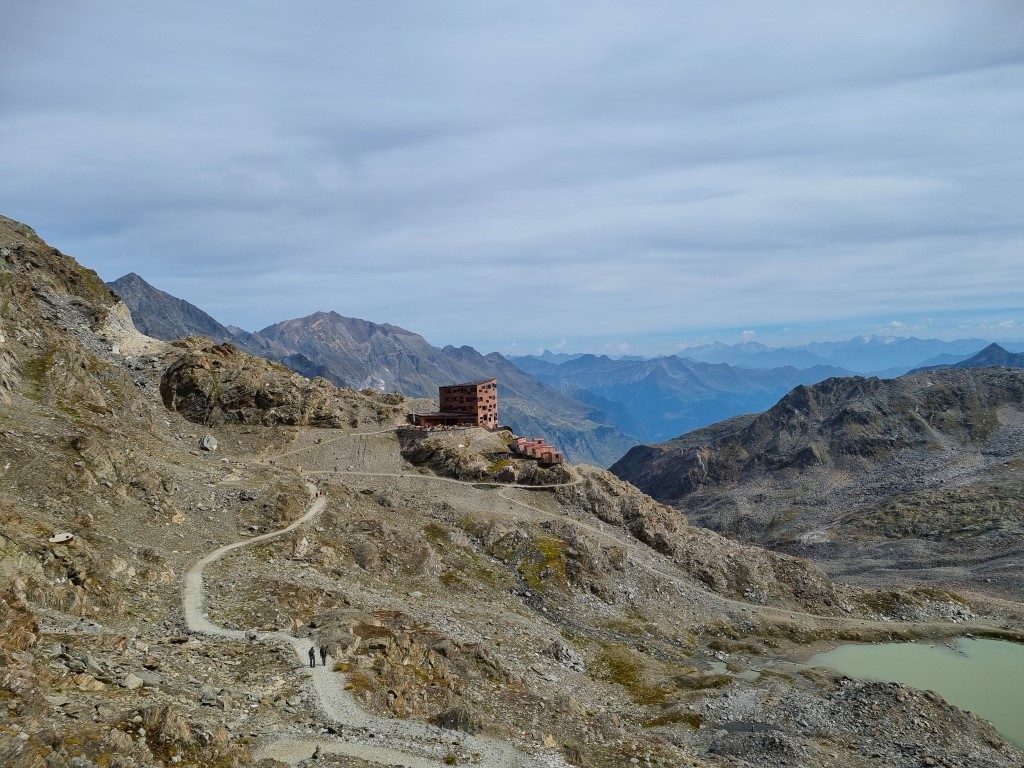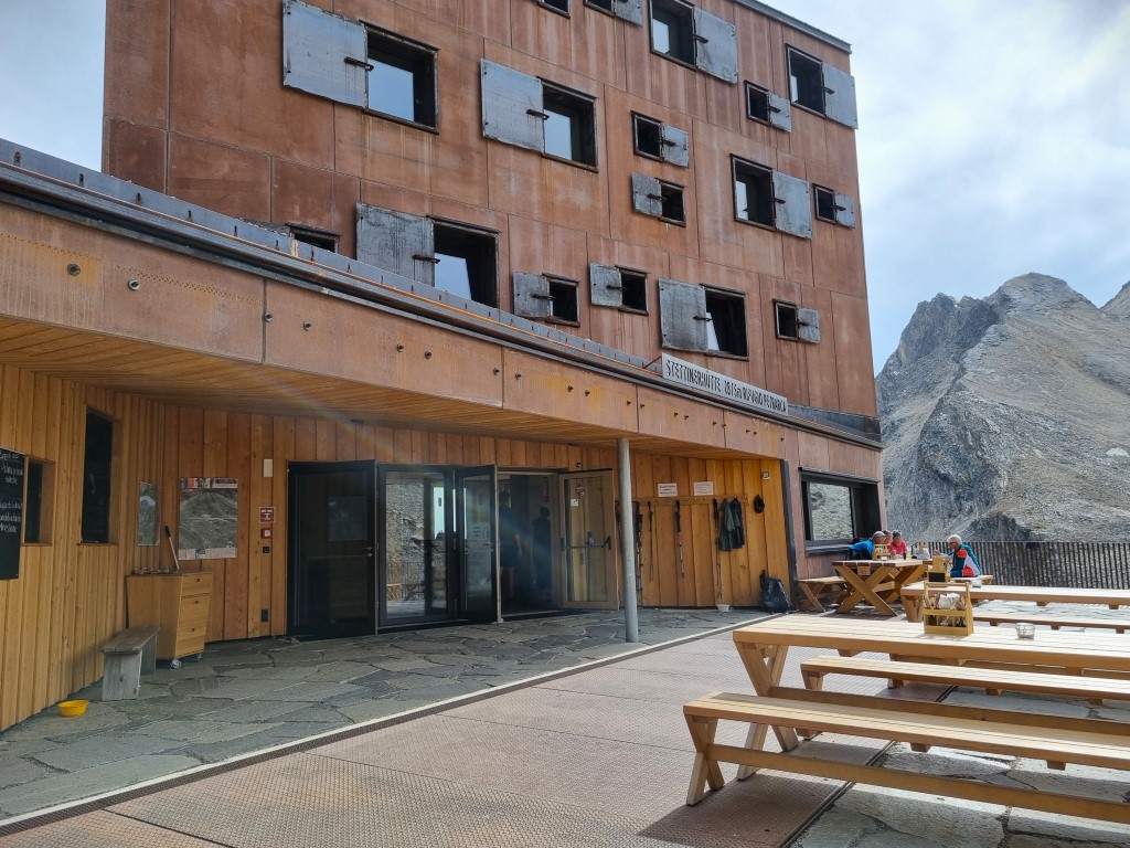 Landskapet blev mer och mer kargt, täckt av skiffer som glimmade som silver, och vi närmade oss krönet. Plötsligt hördes en man som joddlade från höjden! Han hade fått tyrolerfeeling när han nådde toppen, och jag förstod honom. Till slut var även jag uppe på ledens högsta punkt: 2 895 meter över havet. På andra sidan krönet fanns den olivgröna lilla sjön Eisjöchl och den brutalt råsnygga Stettiner Hütte i rostigt cortenstål. Den gamla hyttan drogs med i en lavin i februari 2014 och den nya stod klar sommaren 2022. Åsikterna går isär, somliga tycker att det var fel att frångå traditionell byggnadsstil men jag tycker att den gör sig mycket bra i denna karga miljö, likt på en annan planet. Troligen är den mer lavinsäker också. Vi tog paus på terrassen, med dryck och nudelsoppa.