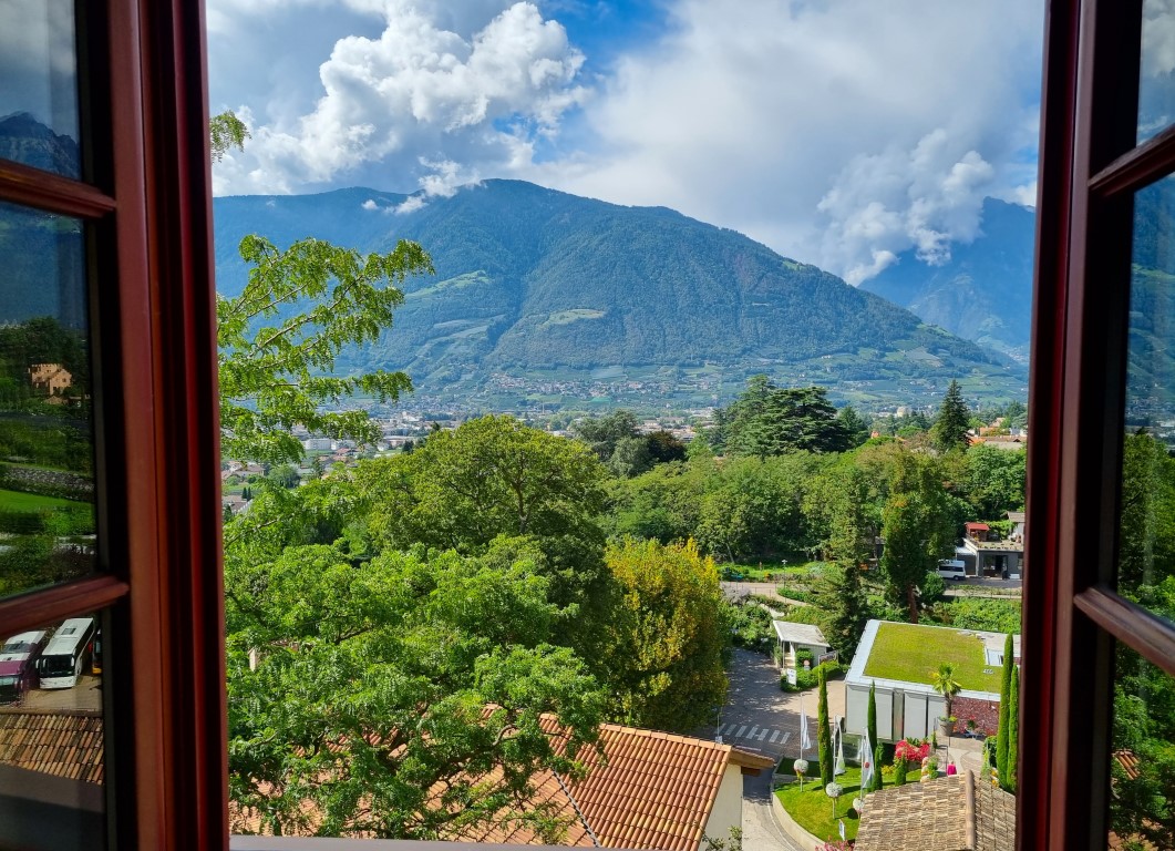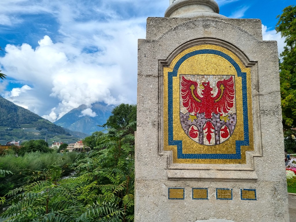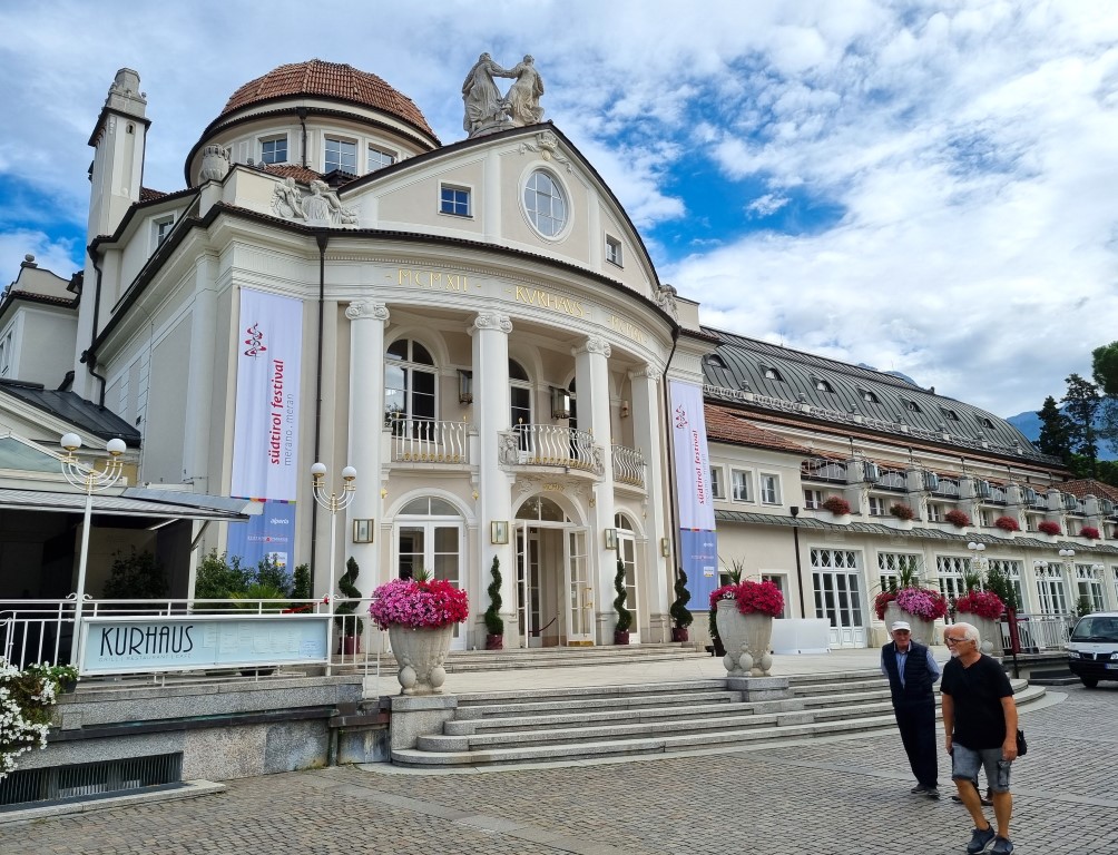 Merano ligger mycket vackert i en dal mellan Sydtyrolens höga bergstoppar, med en sprudlande klar fors som rinner genom staden. Vattendraget heter Passer, eller Passirio. Här blir tvåspråkigheten tydlig; uppe på vandringsleden Meraner Höhenweg var det tyska språket självklart och italienskan bara en formalitet, men nere i Merano är det inte lika självklart. Av stadens drygt 40 000 invånare är det fifty-fifty mellan de som har tyska och italienska som modersmål. Jag skriver Merano och inte Meran som är det tyska namnet, och är alltså inte konsekvent.