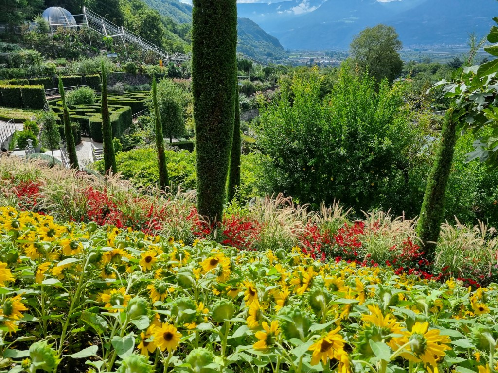 Området är på tolv hektar, med sju kilometer gångväg och hundra meters höjdskillnad. Jag kände att jag hade gjort mitt efter vandringen och höll mig på de lägre altituderna, men fick en fin upplevelse av trädgårdarna ändå. De är indelade i fyra olika huvudområden: Världens skogar, Solträdgårdarna, Vattnet och de terrasserade trädgårdarna och Sydtyrolens landskap. Fantastiskt välskött och sevärt!