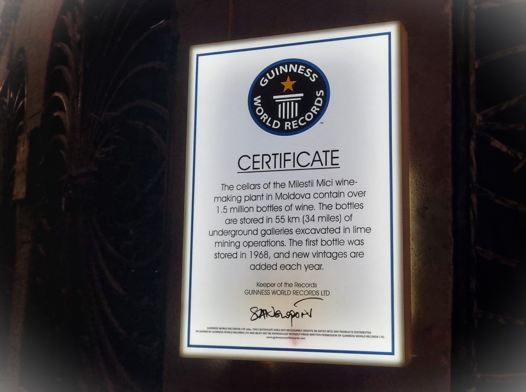 I tunnelsystemets kärna sitter Mileştii Micis stolthet: ett certifikat från Guinness World Record som förklarar att detta är Världens största vinsamling, med sina 1,5 miljoner flaskor! Alla från egen produktion och den nu äldsta från 1973. Alla år framåt är representerade, men det finns extra många flaskor från åren 1986 och 1987. Guiden gav förklaringen: Under åren 1985 till 1987 drev president Gorbatjov en kampanj för att minska alkoholmissbruk och skadorna som följde på detta i Sovjetunionen. Under denna period infördes både handels- och produktionsrestriktioner. Ja, det känns som att kampanjen var vällovlig, men man kan läsa sig till att den resulterade i ökad svarta börs-handel, hembränning, alkoholförgiftningar och ställde hela statsbudgeten på ända, och den avslutades därför efter tre år.