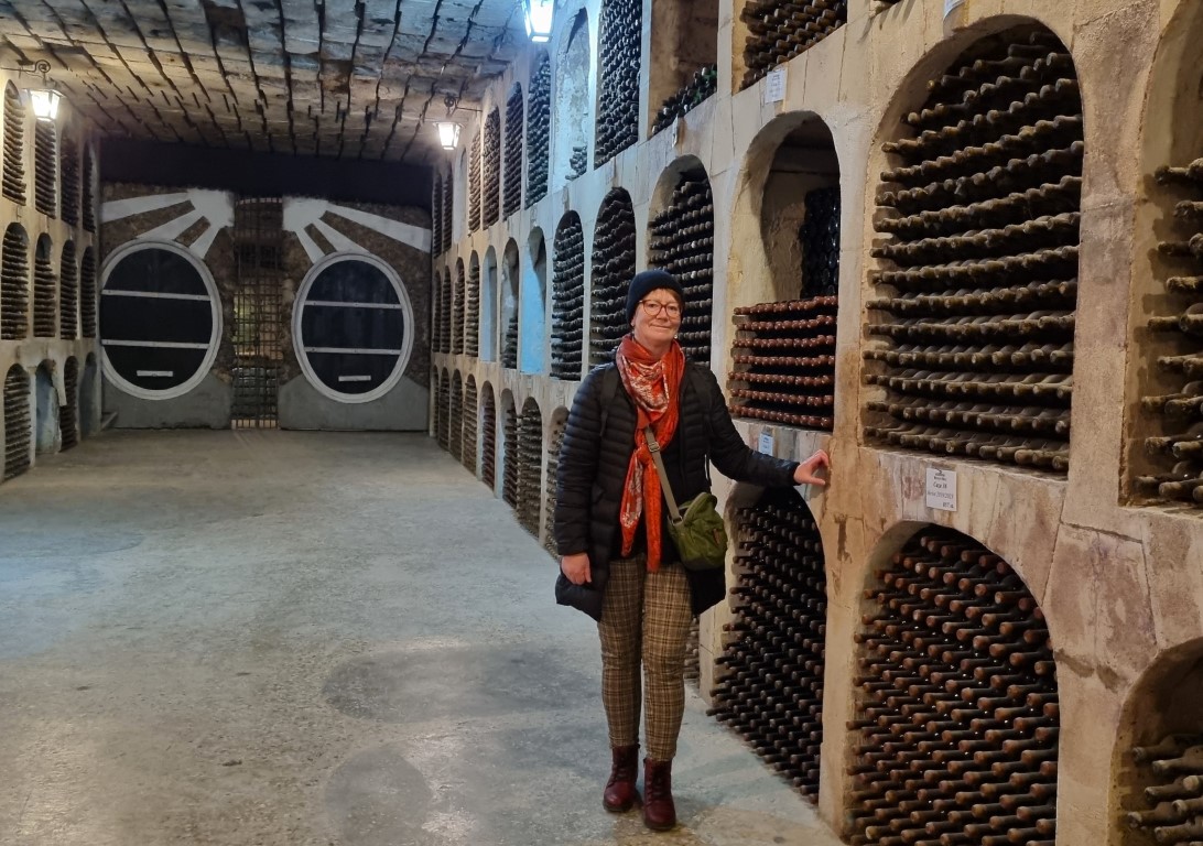 Vingården grundades 1969, och guiden berättade att av den stora produktionen går 65 procent till Kina. Att de upparbetade handelsförbindelserna går åt öst snarare än väst är väl en förklaring till att de är relativt okända i resten av Europa. I en del av tunnlarna fanns gallergrindar framför flaskorna. Dessa är hyrda ”vinkällare” för privatpersoner. Vid varje fack satt en namnskylt, de flesta med kinesiska namn men även presidenten i afrikanska Benin har en samling vinflaskor här.