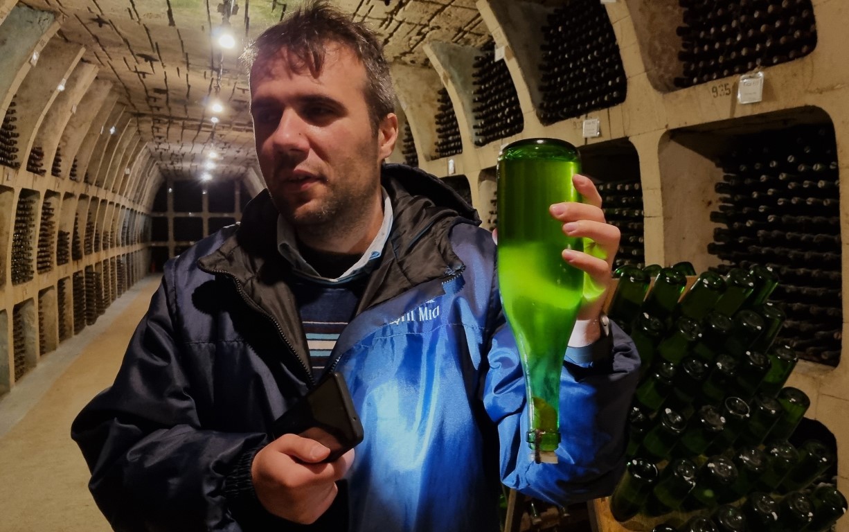 Vid starttiden samlades vi vid ett litet giftgrönt tåg som tog oss in i vingårdens lagringsutrymmen: fem och en halv mil tunnel i ett tjugo mil långt tunnelsystem in i berget, ursprungligen uthugget för produktion av kalksten. En grupp på cirka tio personer huserade i tågets främre del, medan jag och ett italienskt par hölls i sista vagnen tillsammans med en engelskspråkig guide.
