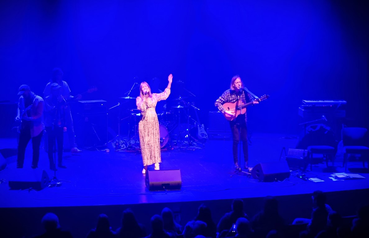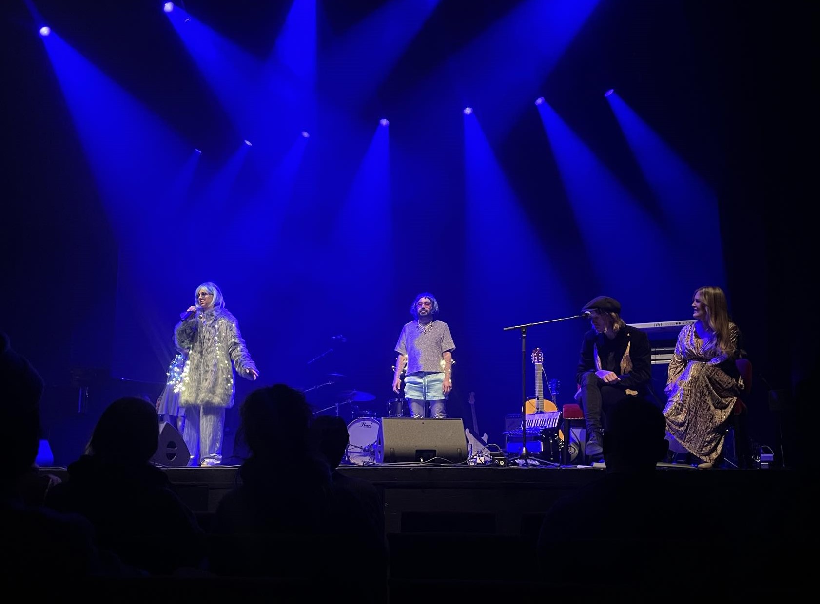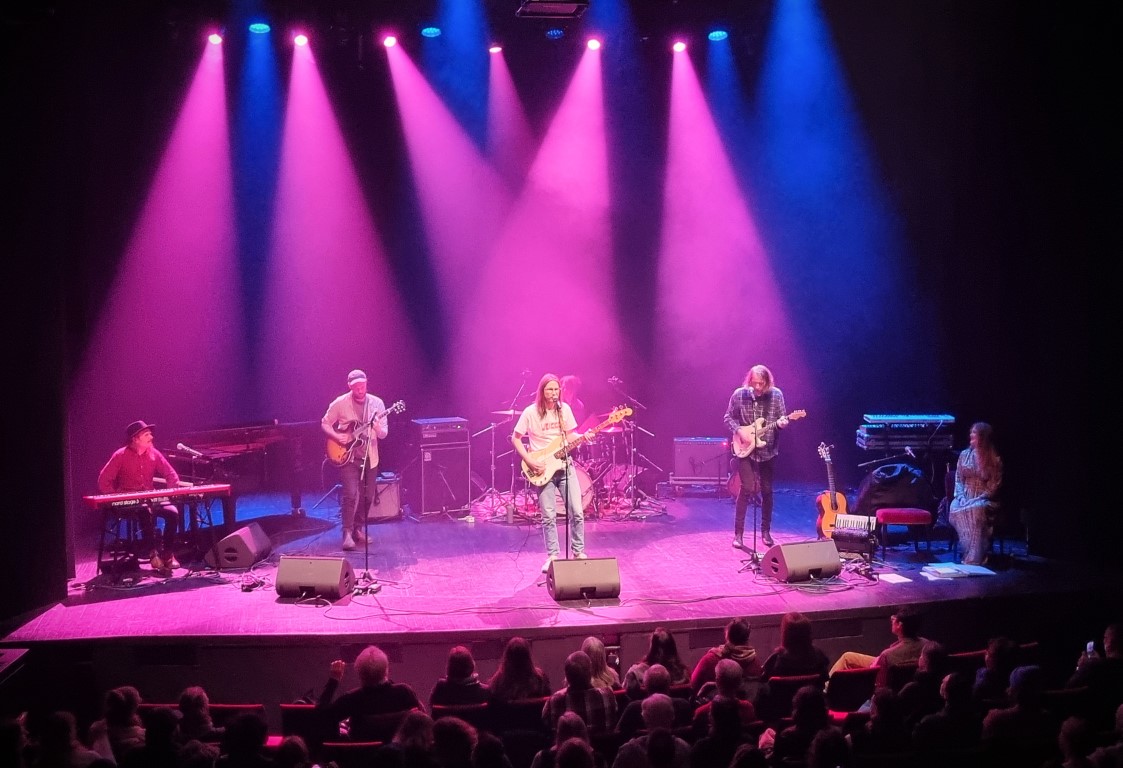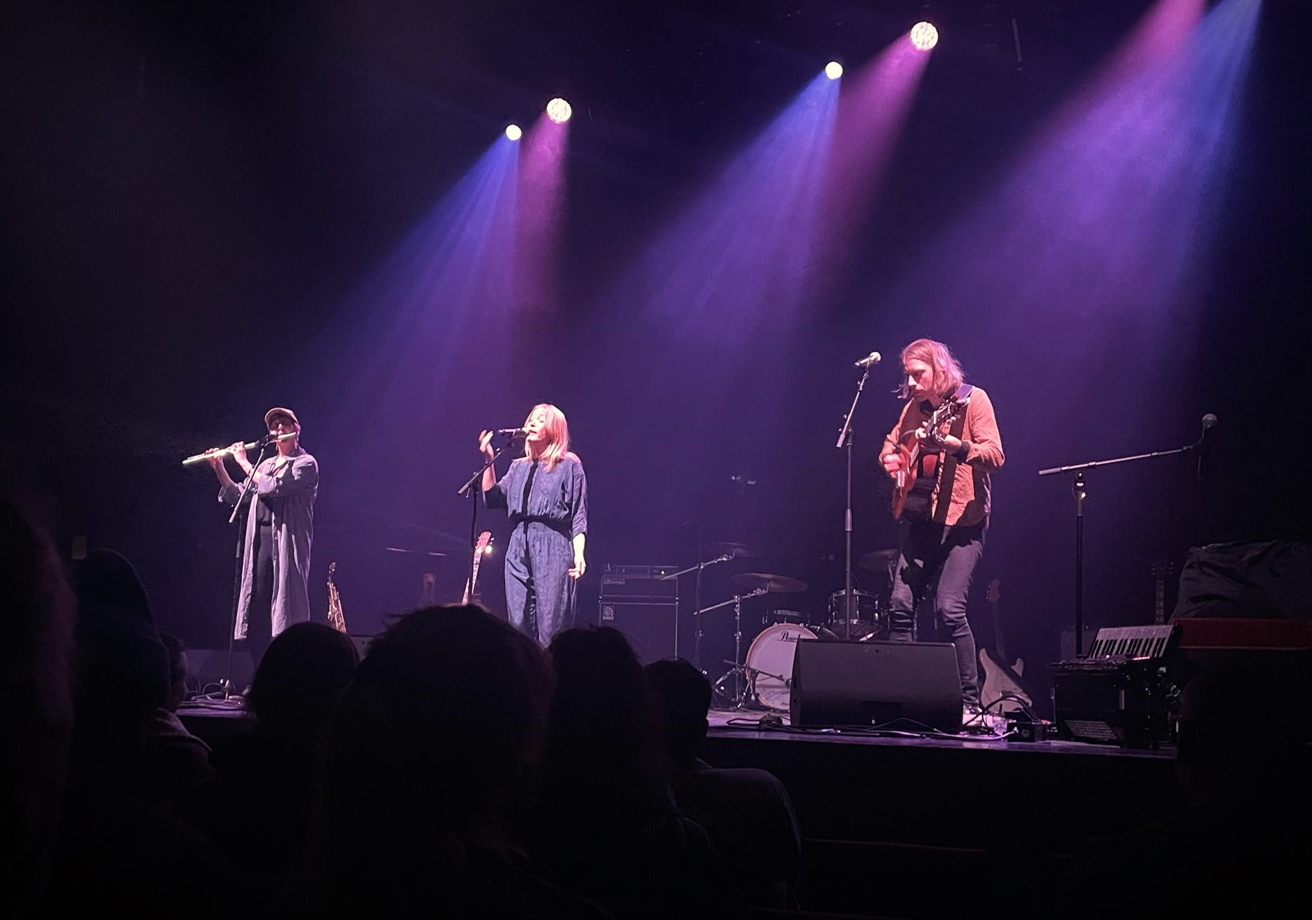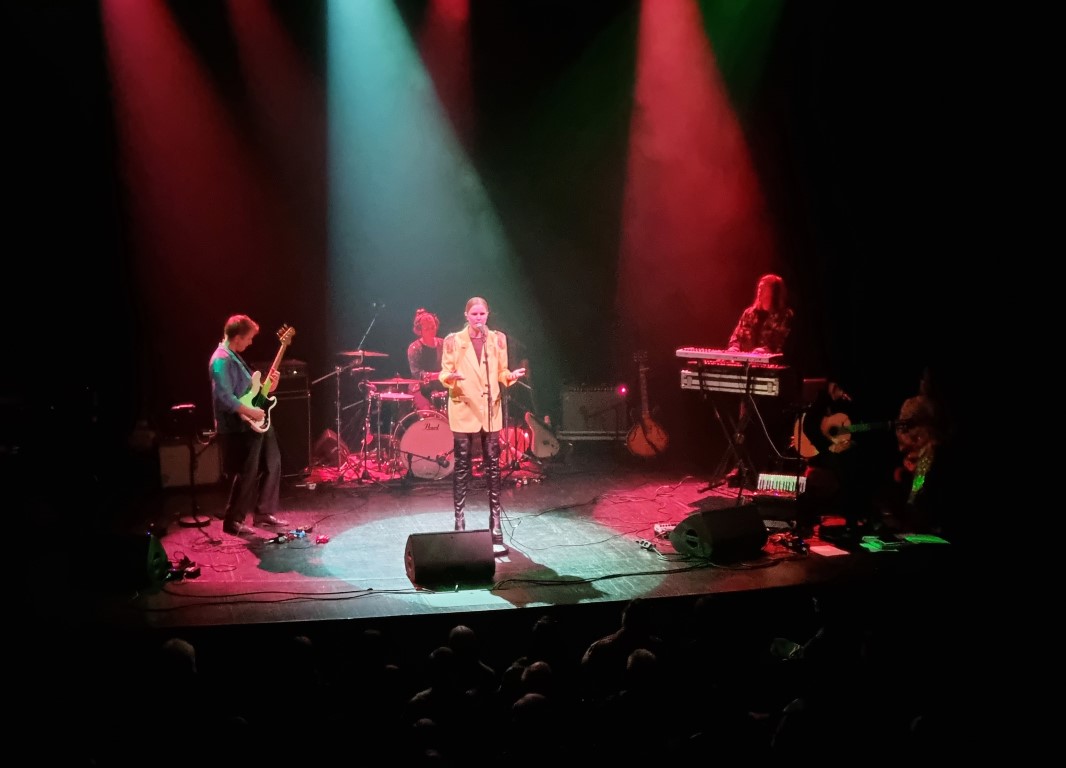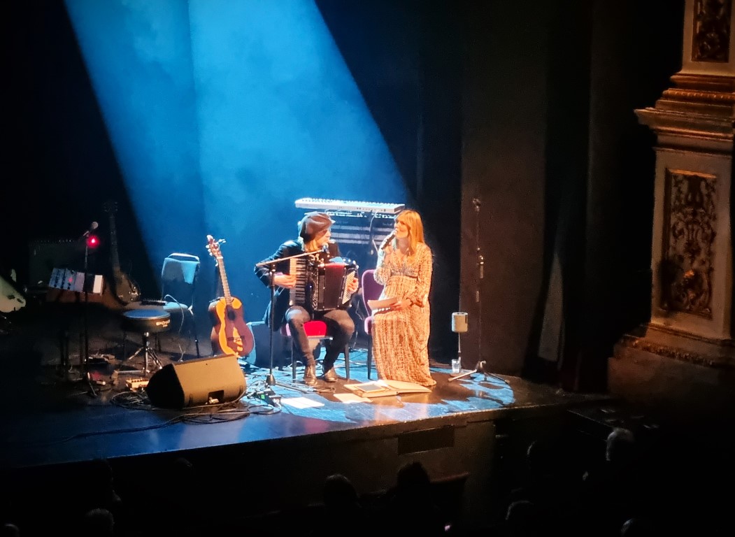 Först ut var Ida Kjellberg som sjöng två låtar ensam med komp av Anton Alvin på synt, och sedan två tillsammans med Christopher Håkansson i indiefolkbandet Blue House – väldigt fint och harmoniskt. Efter det sjöng Tilde Hjelm och tre tjejer i kören, en musik som inte riktigt passade just min smak: stämsång i slow motion med en synt vars ljud tyvärr hamnade i någon slags rundgång (detta gällde också synten i Ida Kjellbergs första framträdande). Sedan en sceniskt framträdande: På tunn is – med dans, musik och filminslag om moderskap med kroppsliga begränsningar. Före paus sjöng Maja-Karin Fredriksson – stark, stämningsfull och melankolisk pop står det på hennes hemsida. Jag skriver under på stark och stämningsfull, men melankolin kände jag inte av. Musiken var snarare upplyftande, och komp av saxofon och tvärflöjt var en bidragande orsak till detta.