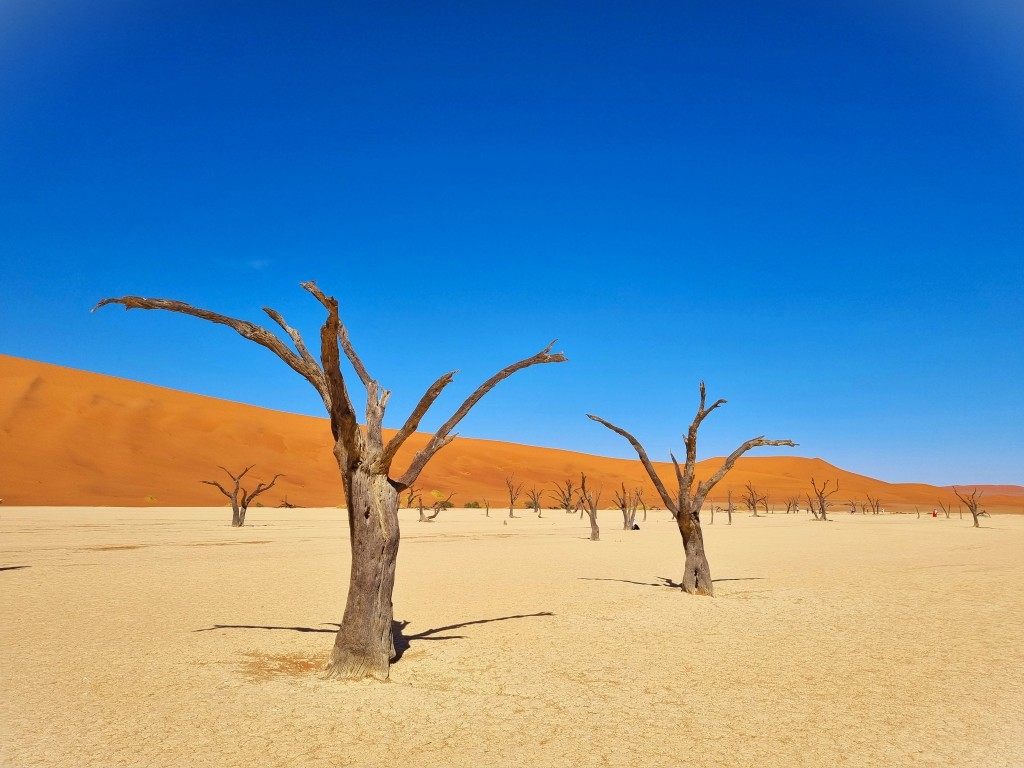 Sossusvlei ligger i Namib-öknen i Namib-Naukluft nationalpark, och är förmodligen den mest spektakulära platsen i hela Namibia. Sossusvlei betyder ungefär Återvändsgränd-sjön, och den består av flera vita saltpannor – en slags uttorkade sjöbottnar – omgivna av några av världens högsta sanddyner av rödockrafärgad sand. Lägg därtill en klarblå himmel, och färgkompositionen är fulländad!