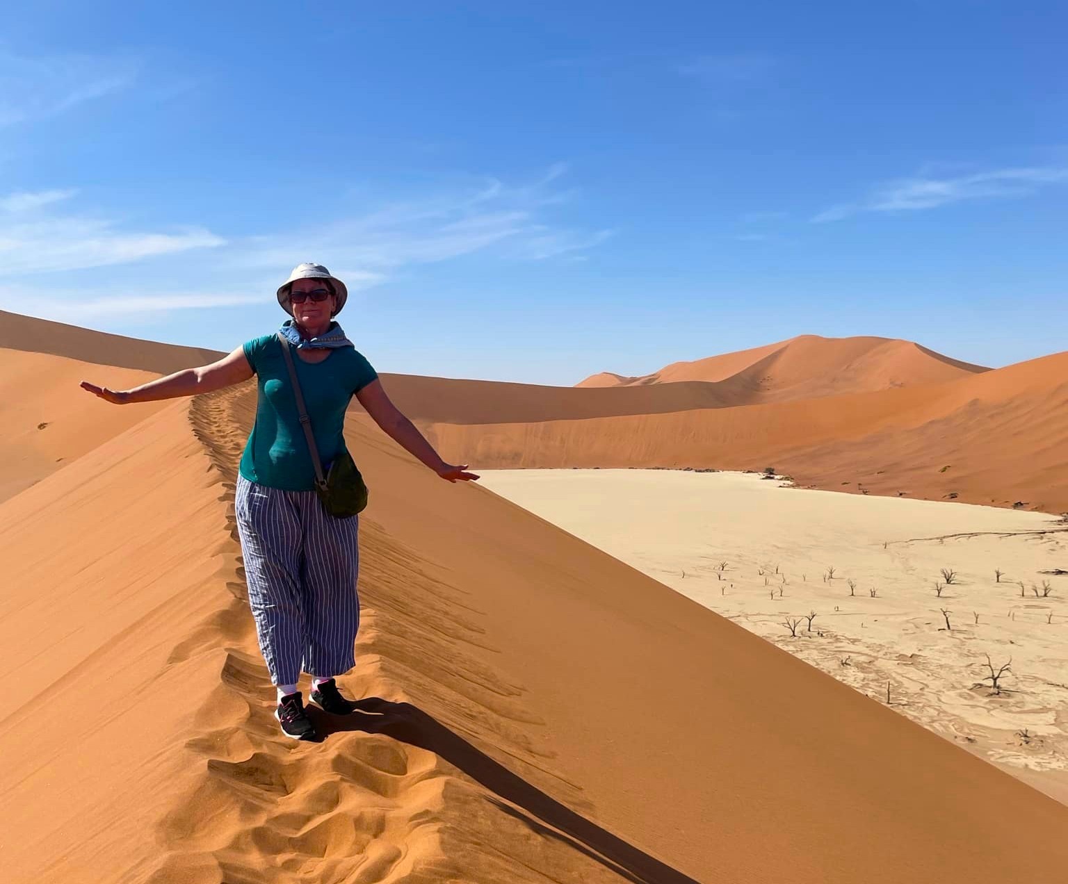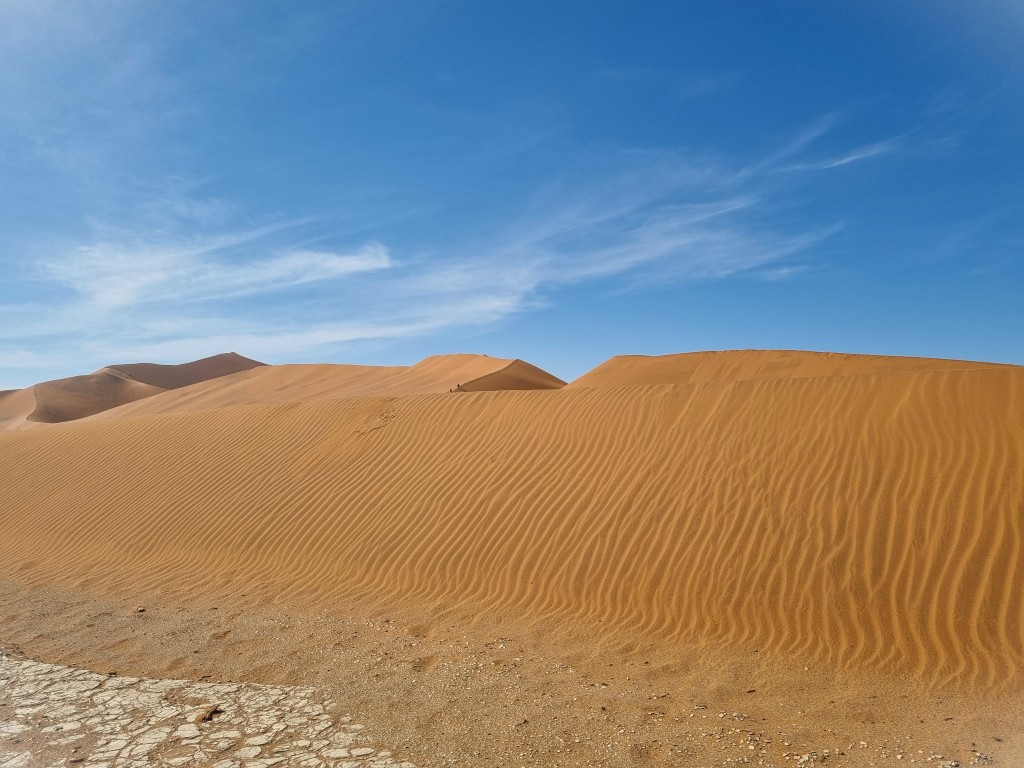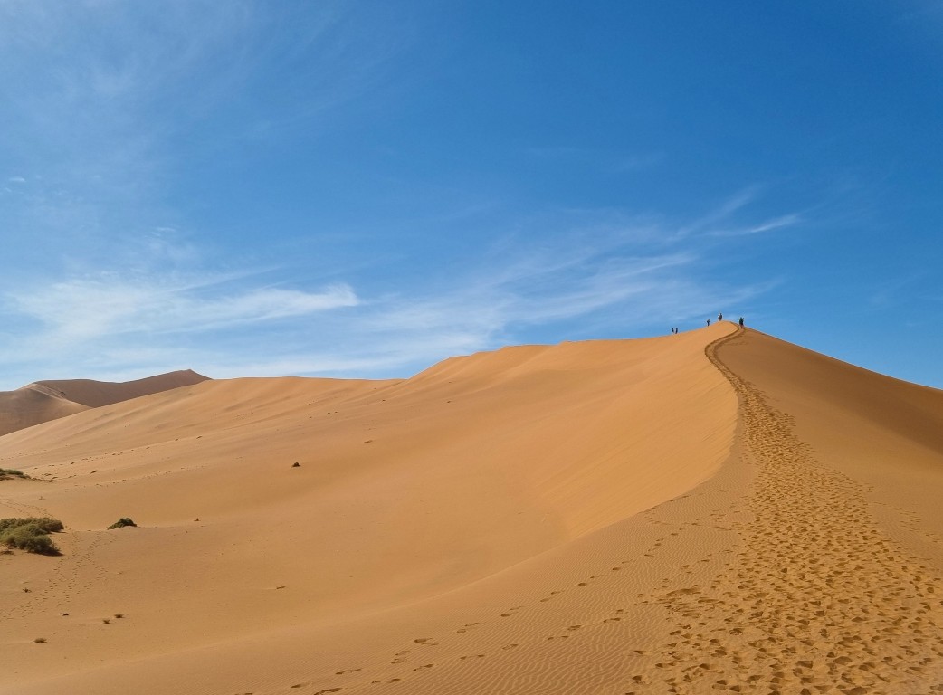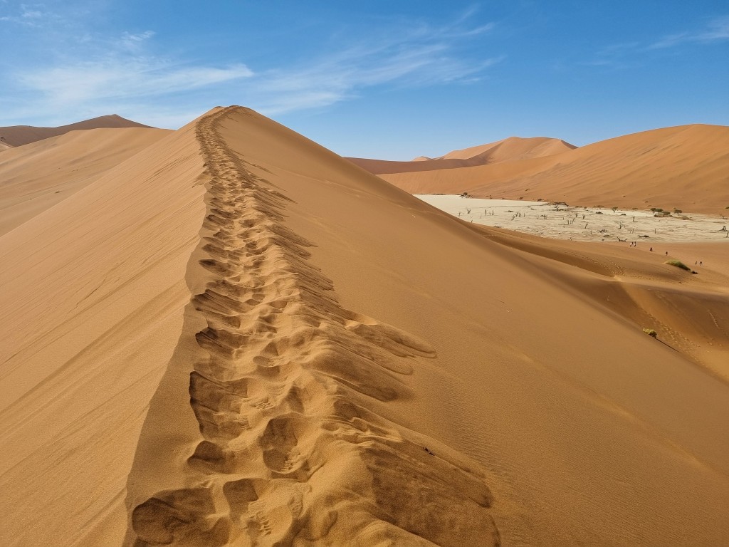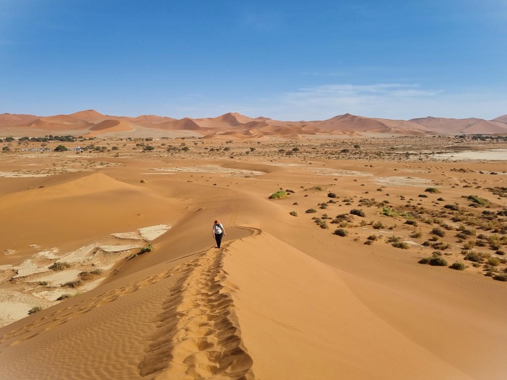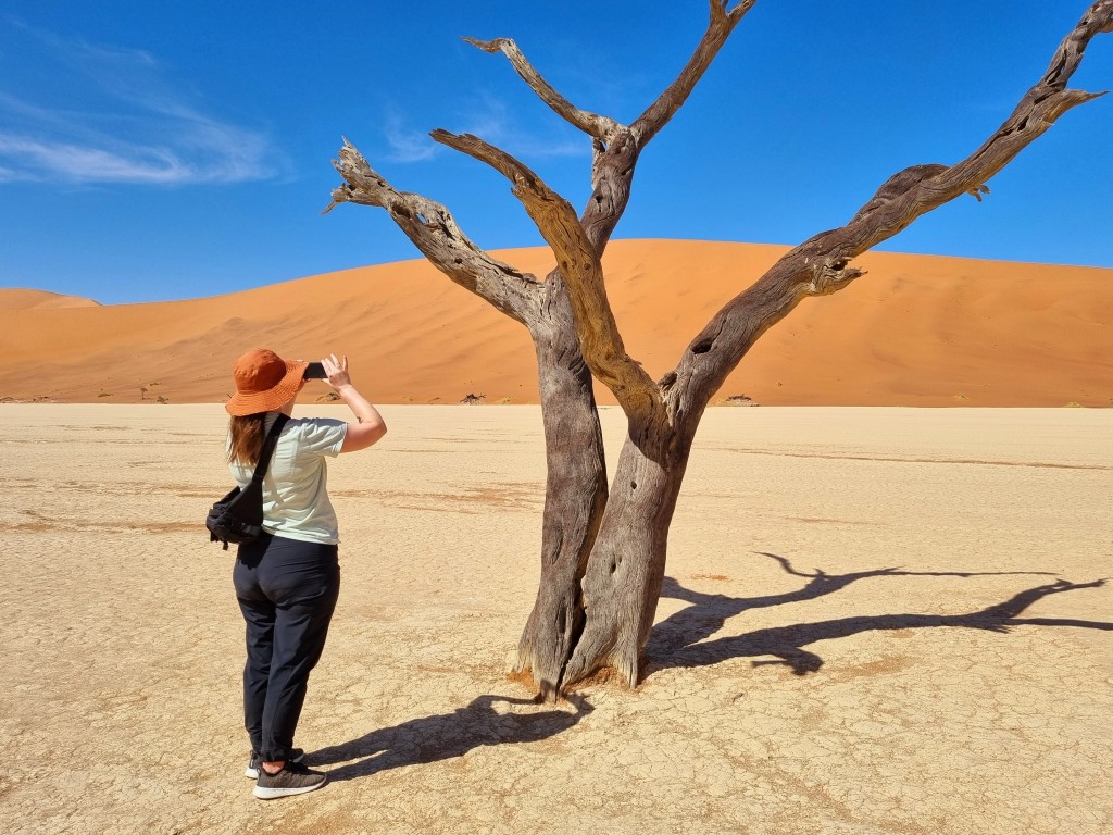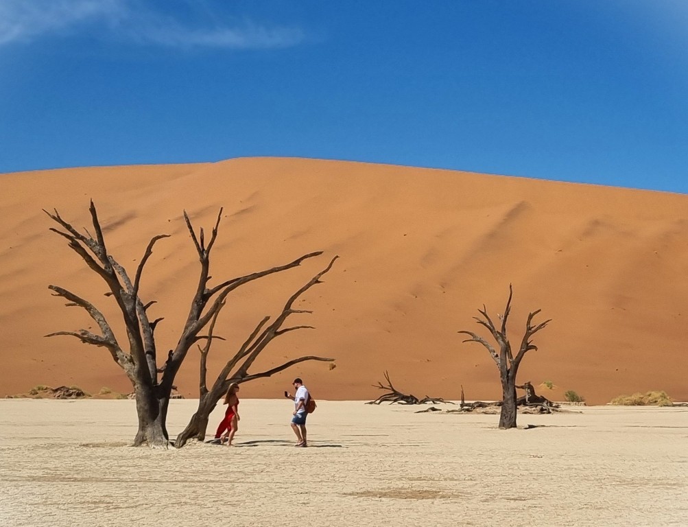 Uppe på dynens högsta punkt har vi en fantastisk utsikt över Deadvlei, platsen som en gång i tiden var en sjö, sedan en grönskande oas i öknen, men som nu är en uttorkad vit salt- och lerkaka med döda akaciaträd som enligt C14-metoden är minst 500-600 år gamla, kanske äldre. Att ta sig ner från dynen; få in takten och pulsa i den lösa sanden med hälarna först är kul men påfrestande, och det är skönt att få fast mark under fötterna igen. Nere bland de förstenade och uråldriga träden är det som att befinna sig i en drömvärld, i en science fiction-film eller kanske ett dataspel (enligt dottern). Så fotogeniskt, så snyggt! Även om detta är en av Namibias främsta sevärdheter så är det glest med turister, det strosar en och annan bland träden och fotograferar dem och varandra. Mest utmärker sig en ung kvinna i lång röd slitsad klänning, som poserar för foton. Hon har inte tagit vägen över sanddynen, och ser oförskämt fräsch ut!