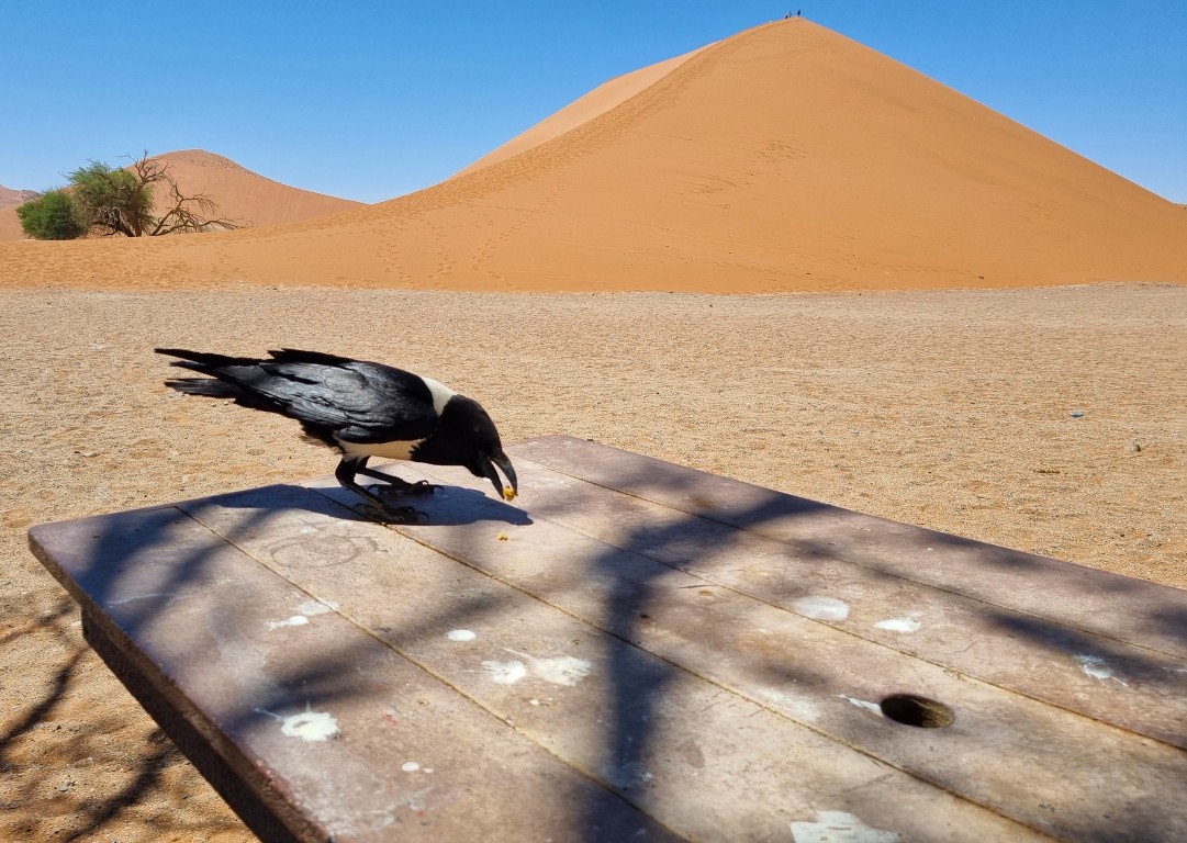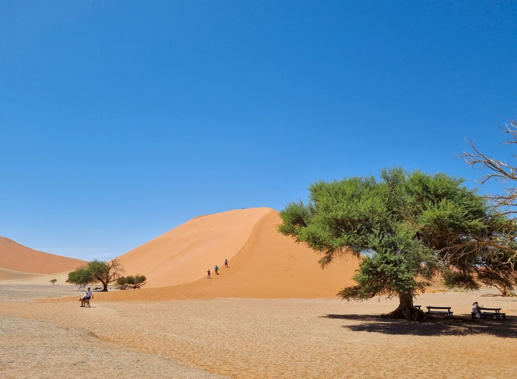 På vägen tillbaka stannar vi vid Dune 45, namngiven efter avståndet 45 kilometer från Sesriem Gate. Den är 80 meter hög och flera syns vandra utmed eggen till toppen, men vi har gjort vårt för idag och ger oss på våra matlådor vid ett bord under ett träd istället.