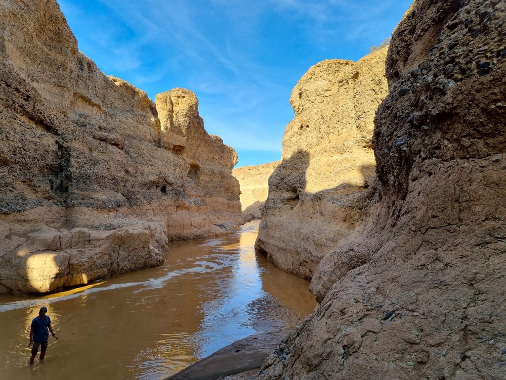 Nu är vattenmängden helt enkelt för stor. I mitten av vadstället är vattnet nära meterhögt, och forsar på med imponerande kraft. Vår guide Gad fattar beslutet att vi ska vända åter till Sesriem Canyon, och sedan tillbaka till vårt boende för att göra ett nytt försök att nå Sossusvlei under eftermiddagen. Sesriem Canyon är skapad av just Tsauchab-floden, så där man vanligtvis brukar kunna vandra i botten av kanjonen är det nu vattenfyllt för första gången på fyra-fem år. En vacker plats, och mäktigt att se de höga väggarna av cementhård sand armerad med runda stenar. Kanjonen är drygt en kilometer lång, runt tre meter bred och sidorna är upp till trettio meter höga.