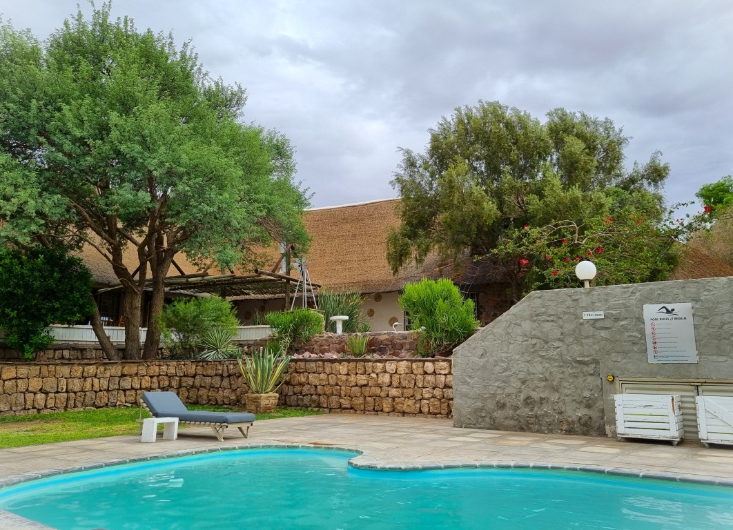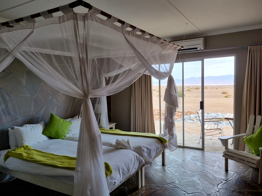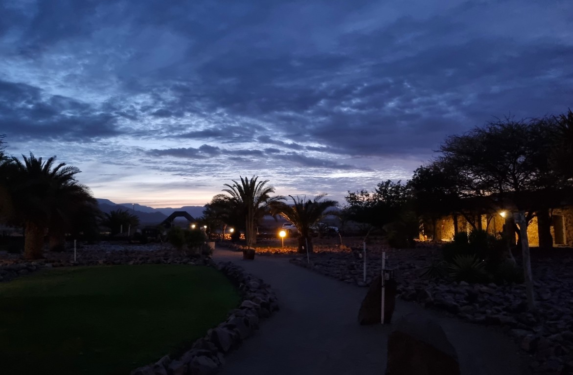 Den härliga dagen i Sossusvlei blir inte sämre av att vi bor på ett fantastiskt boende både natten före och efter: på The Elegant Desert Lodge. Rummen, utemiljön, poolområdet, restaurangen med en fyrarättersmåltid varje kväll – allt är smakfullt och tiptop! Små finesser som uppbäddat med en godnattsaga på kudden när vi lägger oss, och vilda djur som schakal och oryx passerar strax utanför uteplatsen när mörkret faller.