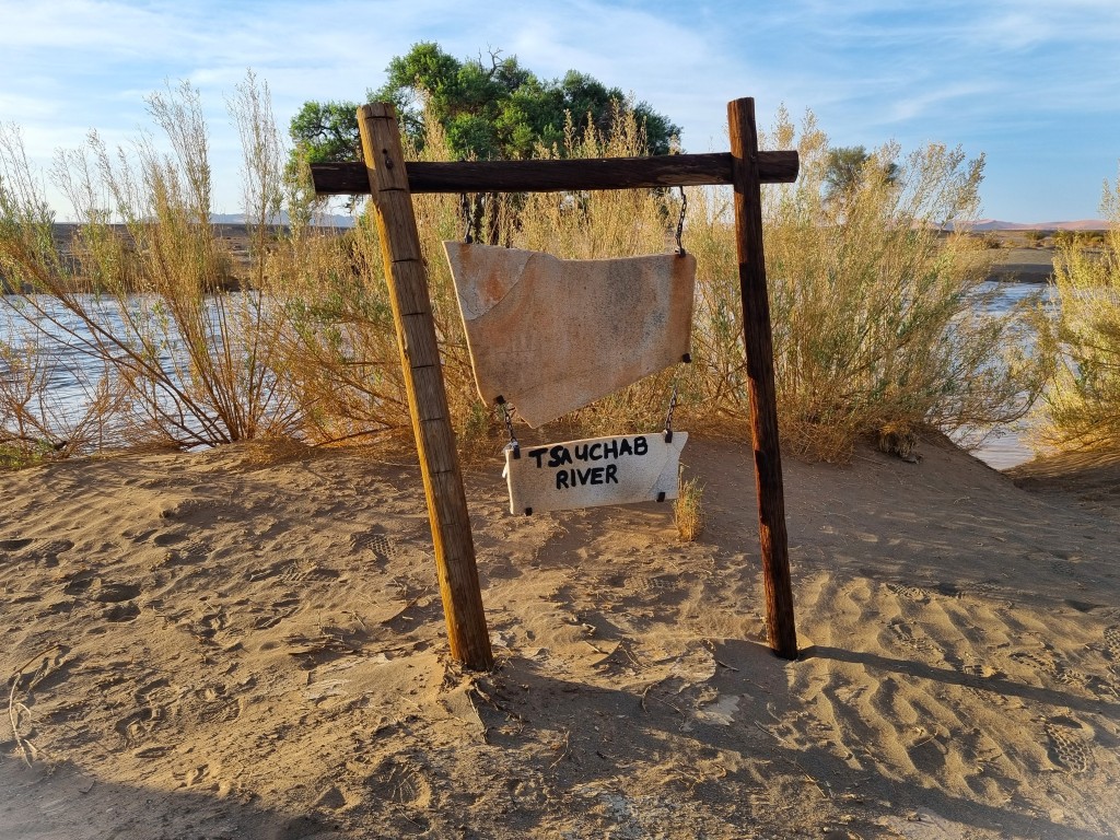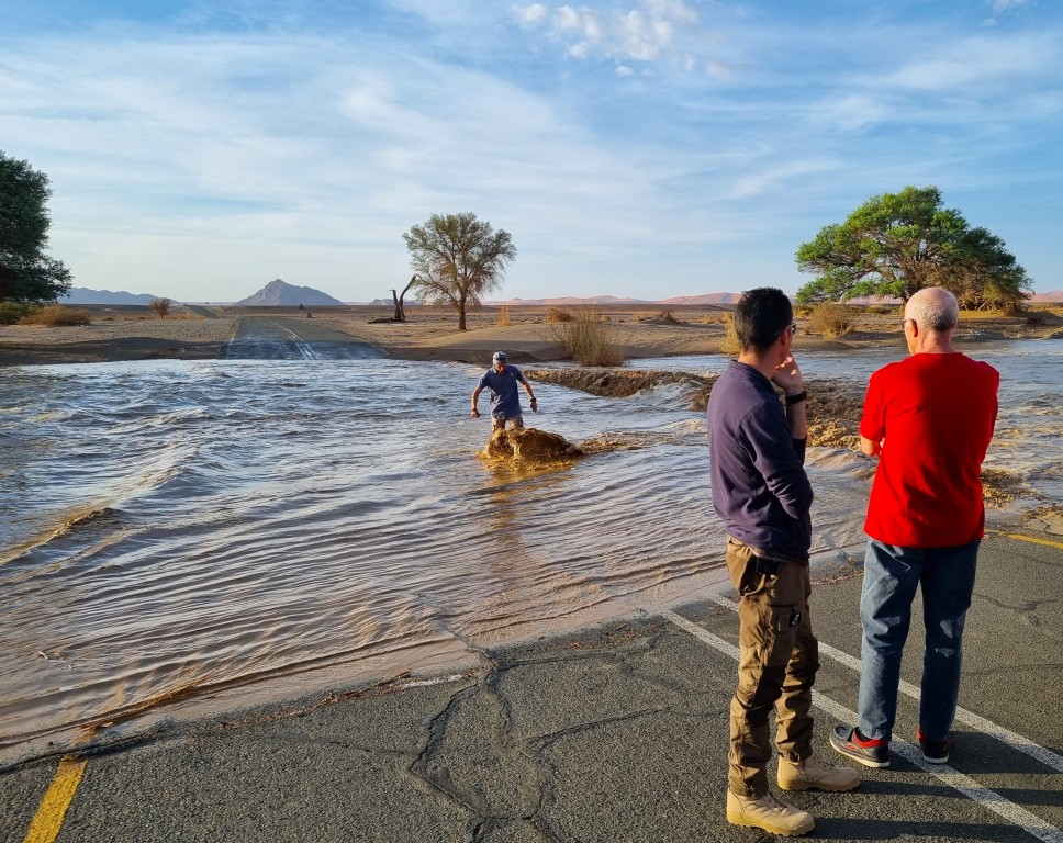 Vi är på en av världens torraste platser och blir hindrade av forsande vatten, hur höga är oddsen för det? Tydligen har det varit häftiga skyfall i Windhoek trettio mil bort, och vattnet har tagit sig ända hit via floden Tsauchab, i imponerande mängd. Namibias floder är oftast torrlagda, och det har bara byggts broar över dem på de allra största vägarna. I övrigt är det ”vadställen” för bilar som gäller; en svacka uppmärkt med vägskylt och oftast asfalterad för att undvika att det blir urgröpningar i vägen vid de få tillfällen då det rinner förbi vatten. Där ska bilarna sakta men säkert köra över, i vattnet eller utan.