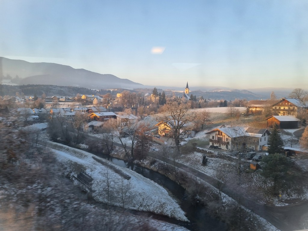 I München fick jag en timme till att göra min morgontoalett på stationen, och köpa en kaffe och två brezel: de lätt saltade kringlorna som är mina favoriter i Tyskland. Färden gick vidare via Wien till Budapest, till en början genom ett snöpudrat alplandskap. Det här tåget var helt fullsatt och vissa fick stå, så här var det verkligen skönt att ha en platsreservation. Stoppet i Budapest blev bara lite över halvtimmen, så jag skyndade mig att köpa matsäck på stationen. Även denna natt åkte jag i sittvagn, på tåget mot Rumänien. Nattsömnen stördes ibland av barns blippande julklappar och farbröder som kollade tiktok med ljudet på, men jag fick ändå några timmars sömn och kunde till och med sträcka ut mig med fötterna på sätet mittemot.