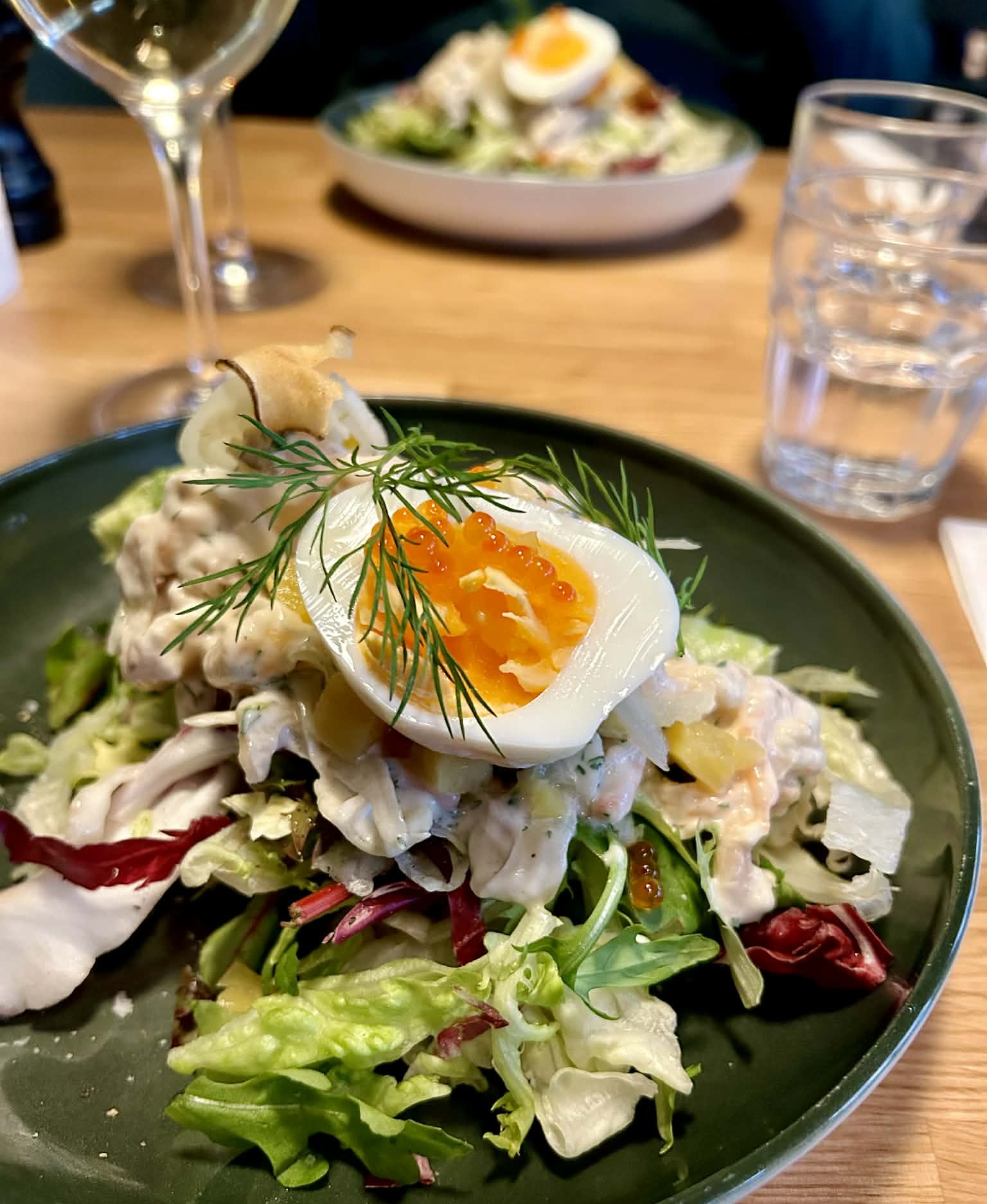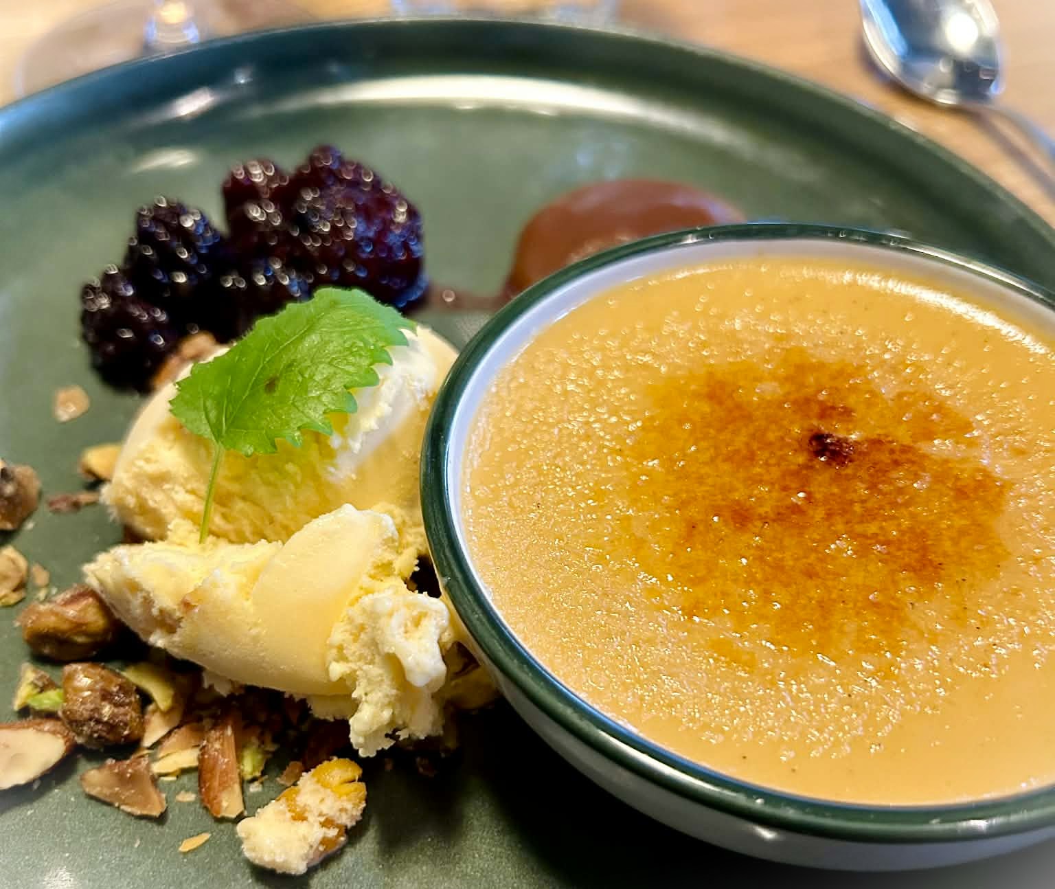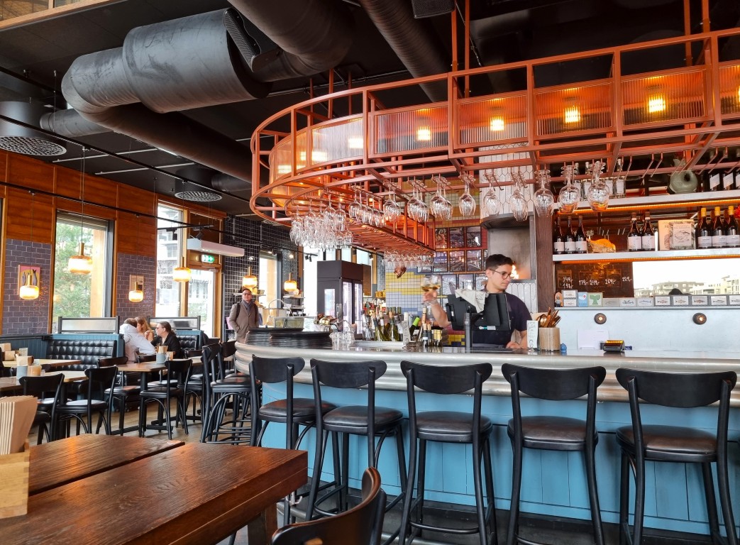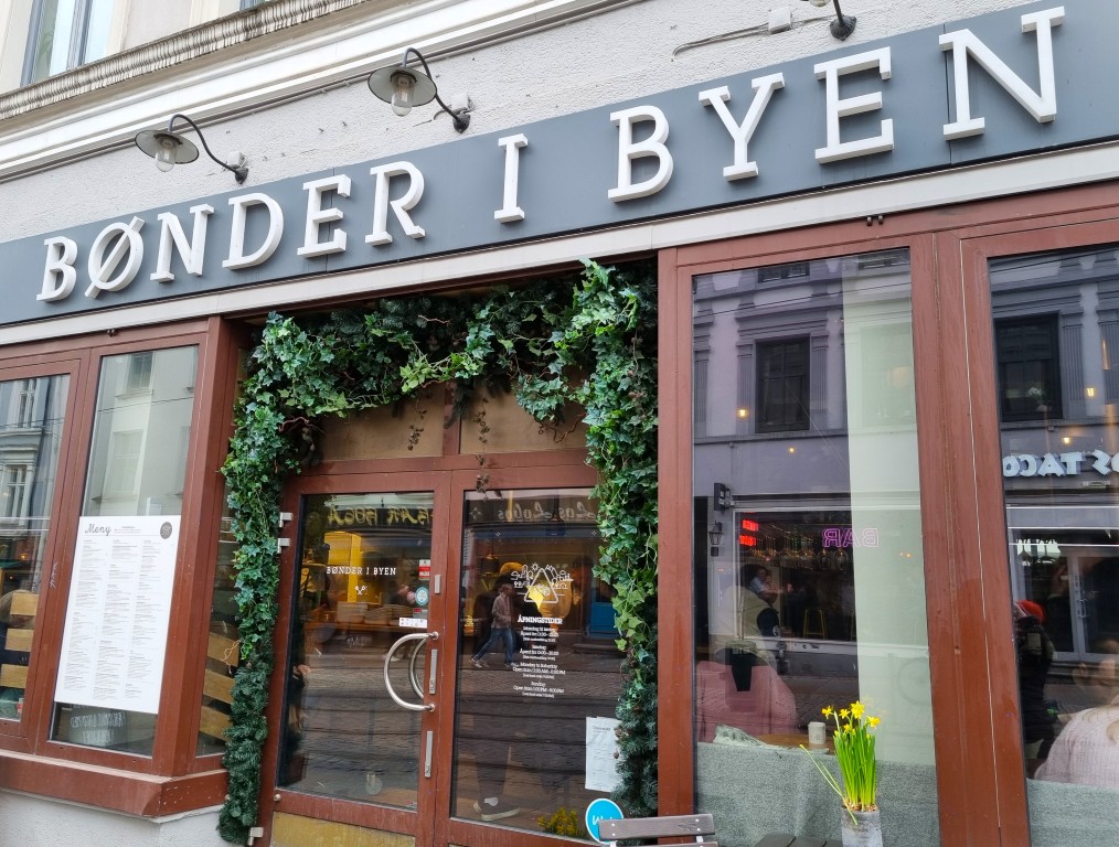 På lördagen promenerade vi i Grünerløkka, och åt vår lunch där på en kul restaurang med tema: Bønder i Byen (alltså Bönder i stan på svenska). Lokala råvaror levererade från bönder i närliggande områden, konserverad frukt i burk som dekoration och serveringspersonal iklädda gröna tröjor med emblem FK: Felleskjøpet (likt Granngården i Sverige). I menyn fanns både Kraftfôr (kraftfoder: energität frukost) och Kalvefôr (kalvfoder: barnmeny). Skojigt tyckte jag, och ett mycket välbesökt ställe med god mat. Vi åt varsitt matigt smørbrød med räkröra och mycket grönt, och varsin brûnostbrulée: brulée med mesost, hjortronglass, björnbär och karamellsås.