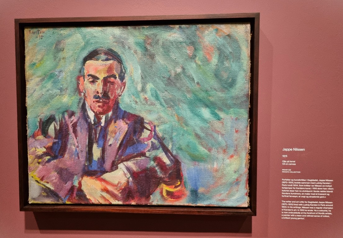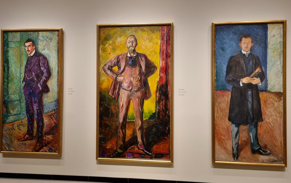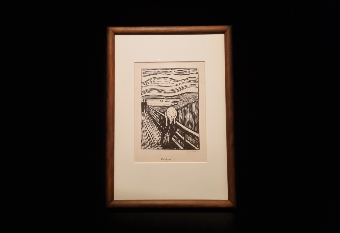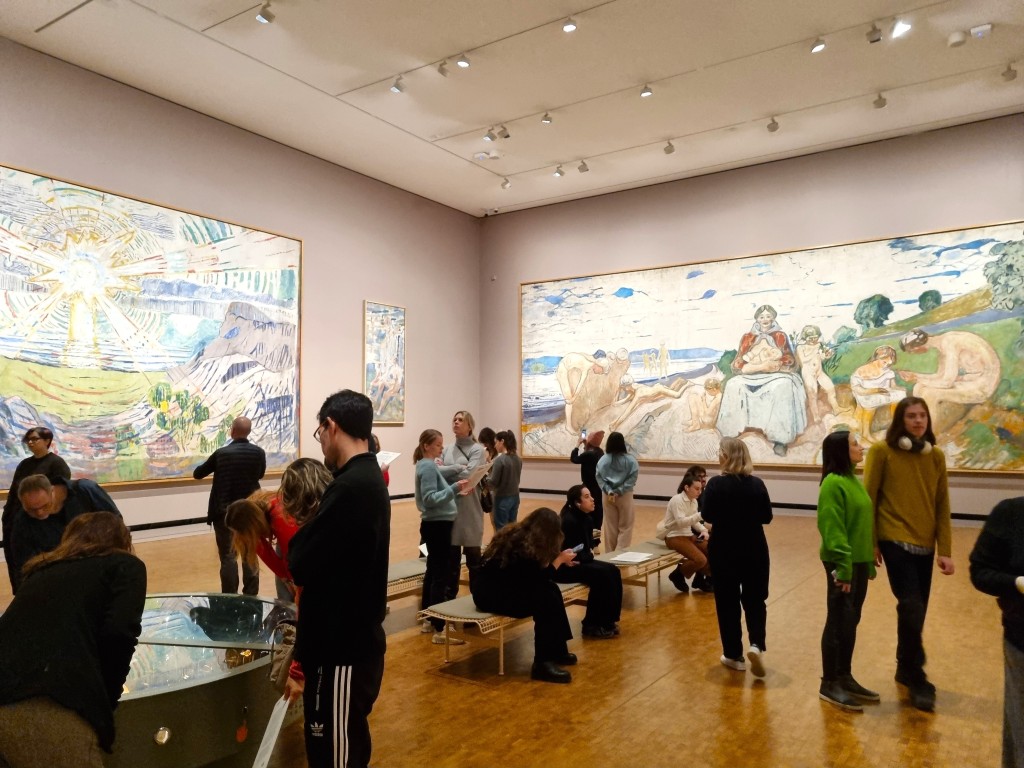 Vi hade förköpt biljetter till söndagen (220 kr/person) med anvisat inträde mellan 10.30 och 11.00, och vid den tiden var det fortfarande relativt glest i salarna. Vi åkte högst upp, kollade på utsikten och jobbade oss sedan neråt i utställningssalarna. En temporär utställning med Munchs samtida Ludvig Karsten, en utställning om Munchs träsnitt och Skygger: om hans hem. En med hans monumentala målningar, så stora att de fick lyftas in med kran. Och så på våning 4: Uendelig: den största utställningen med Munchs mest kända målningar. Här finns ett ”rum i rummet”, som visar Skriet i tre versioner: litografi, målning och pastell – en i taget, en halvtimme åt gången. De är ganska små målningar, likt Mona-Lisa förvånansvärt anspråkslösa men tveklöst med kultstatus. Jag vill slå ett slag för motivets namn på originalspråket: Skrik. Skrik är väl ett ord som fungerar utmärkt på svenska? Översättningen Skriet låter gällt och hysteriskt, eller som ett ljud en åsna skulle ge ifrån sig.