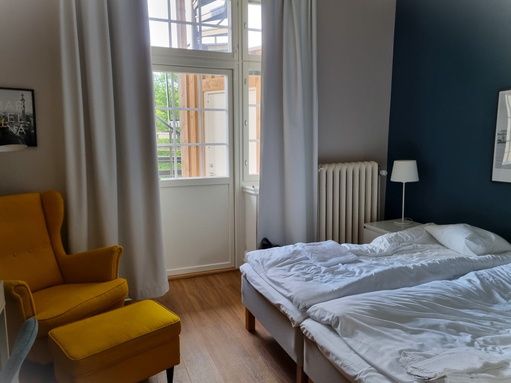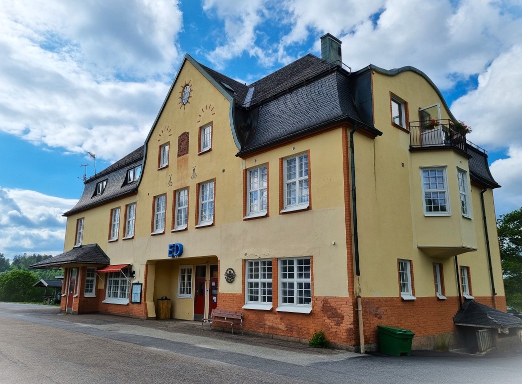 Eftersom det här var ett tvådagarsprojekt med ytterligare ett nationalparksbesök inplanerat på fredagen så behövdes en övernattning. Jag bokade ett rum på Stationshusets bed & breakfast i Ed, och det var ett mycket bra val! Ett stilfullt och fräscht boende på stationens andra våning; här finns nio rum med sammanlagt sjutton bäddar, ett gemensamt kök och sällskapsrum samt tre badrum att dela på. Rummen heter Loket, Stinsen, Konduktören, Biljettluckan, Andra klass, Kupén, Sovvagnen, Första klass och Perrongen. Jag hade bokat Perrongen, men blev uppgraderad till Första klass med balkong och en flik utsikt över sjön Stora Le för samma pris: 1050 kronor för två personer. Frukostpaket fanns att beställa.