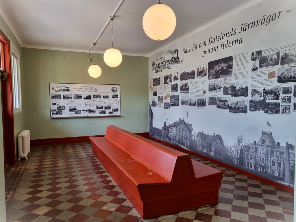 På inramade tavlor berättades om stationshusets historia. Det första stationshuset på platsen byggdes 1879, men pingstafton 1910 brann byggnaden ner till grunden tillsammans med det närliggande Järnvägshotellet, Hotell Drott och Lilla Hotellet: Ed var en kurort och då mycket välförsedd med boendemöjligheter. 1912 stod det nya stationshuset klart i nationalromantisk stil, ritad av arkitekt Yngve Rasmussen. Extra roligt är att detta fortfarande är ett RIKTIGT stationshus; i bottenvåningen finns en väntsal och utanför stannar tågen med jämna mellanrum: i nuläget verkar sträckan trafikeras av norska Vy mellan Trollhättan och Halden.
