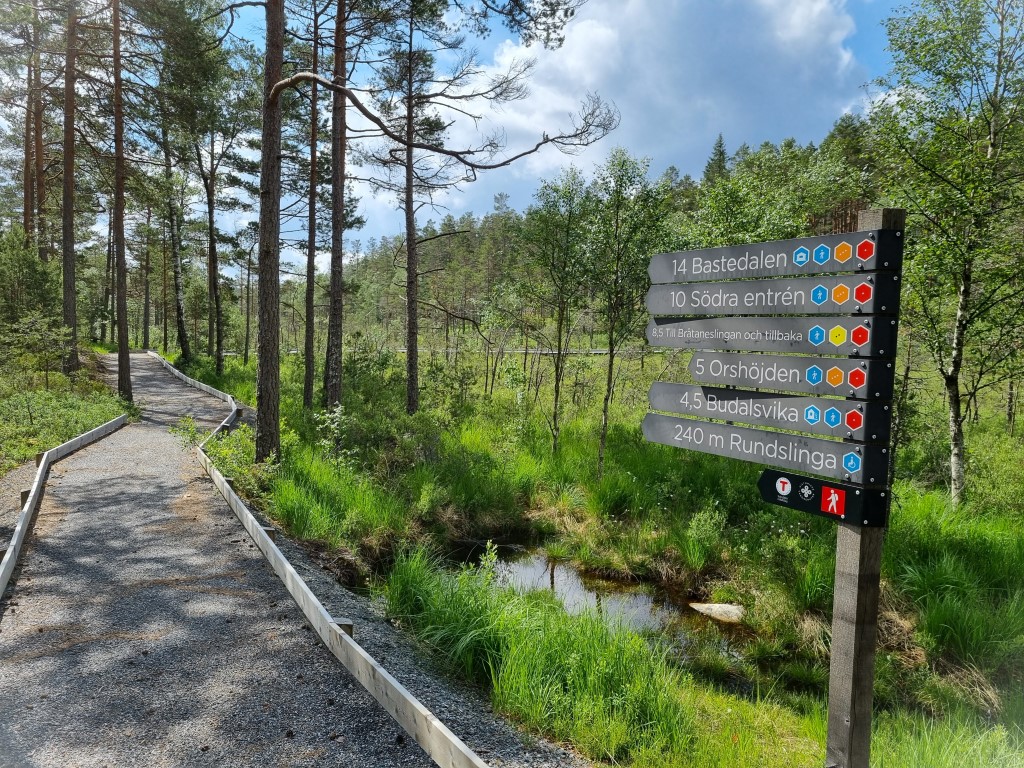 Tresticklans nationalpark inrättades 1996 och den är 2 900 hektar stor. Vid nationalparkens huvudentré finns informationstavlor och en 240 meter lång tillgänglighetsanpassad slinga på spång. Bra ordnat, men lite längre än så hade vi tänkt oss! Från huvudentrén är det 4,5 kilometer tvärs över till Budalsvika och norska gränsen. Den 4,3 kilometer långa Bråtaneslingan utgår från Budalsvika-leden, och det går också att följa Orshöjdsleden ända ner till parkens södra ände. Vår tur blev en kombination av Budalsviksleden och Bråtaneslingan på sammanlagt knappt en mil.