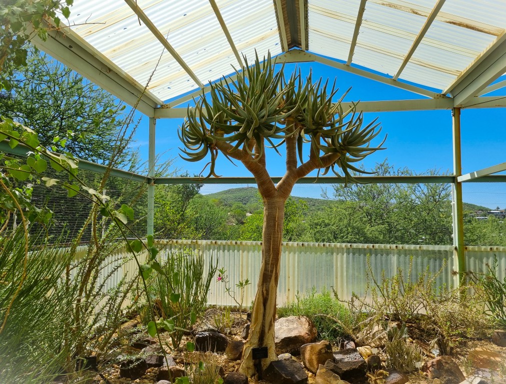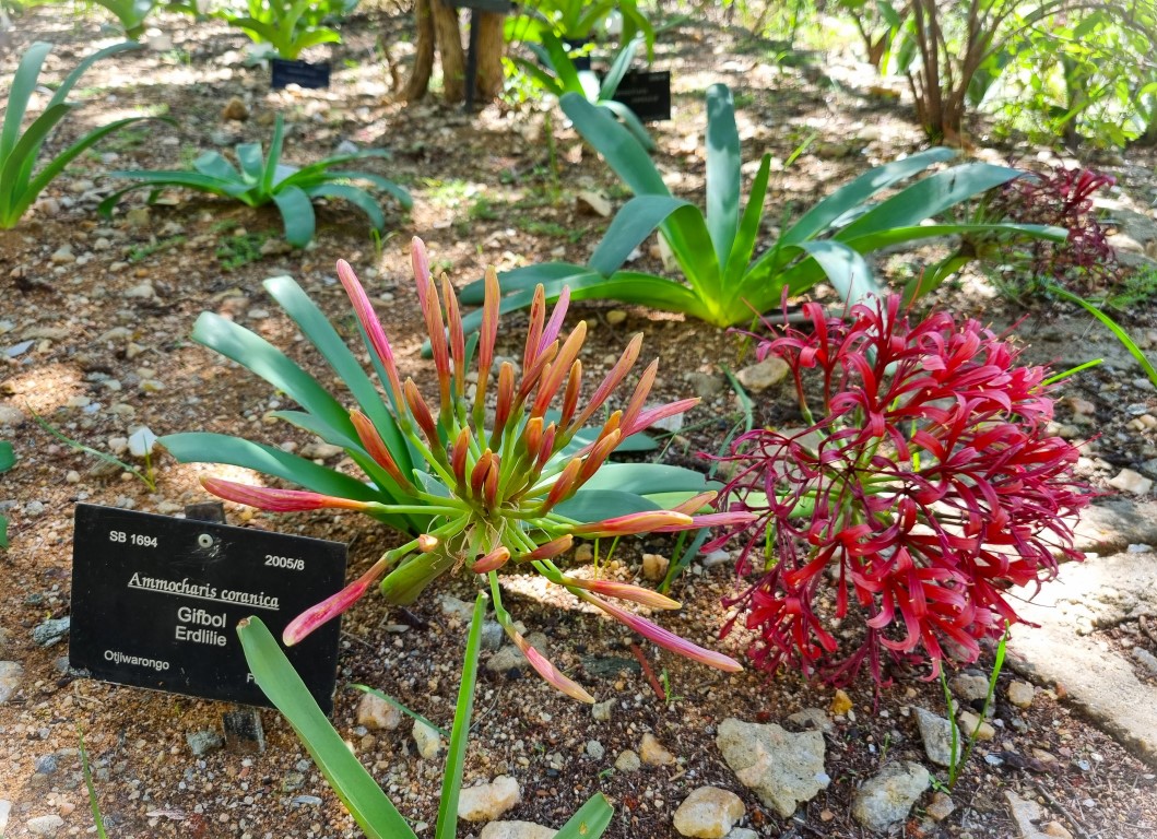 Lyckan var stor när jag upptäckte att det fanns en botanisk trädgård i Windhoek, och jag valde delvis vår boende för de sista dagarna utifrån detta; med ett strategiskt läge mitt emellan Kristuskyrkan och trädgården. Den här botaniska trädgården på 12 hektar i en torr sluttning har ingen samling av exotiska växter från jordens alla hörn, utan är mer som ett reservat för Namibias inhemska växter. Och det var verkligen värdefullt för mig, för under rundturen i landet hade jag mest susat förbi växterna i hög fart, eller varit förbjuden att lämna bilen i nationalparkerna. Här kunde jag fotografera, läsa namnskyltar, peta och lukta och förundras över alla överlevnadsstrategier i ett extremt torrt klimat.