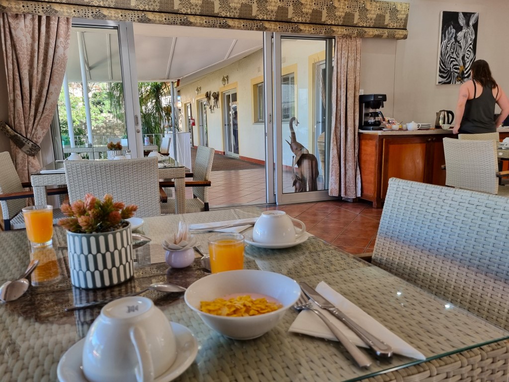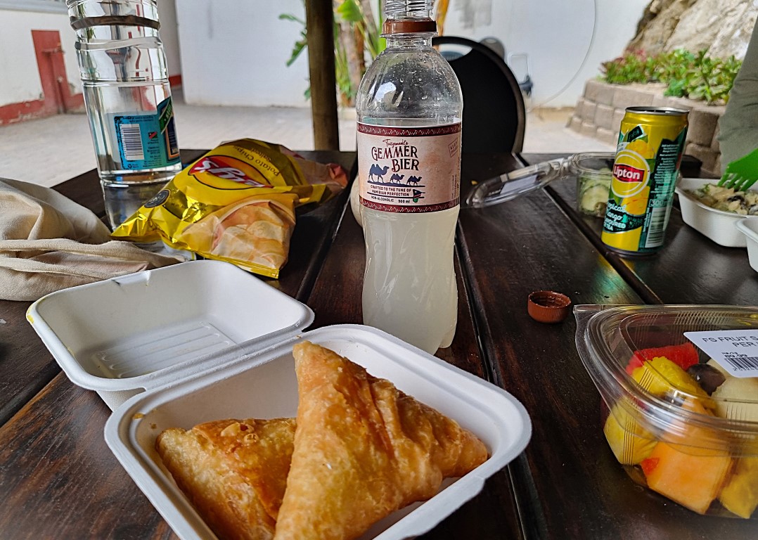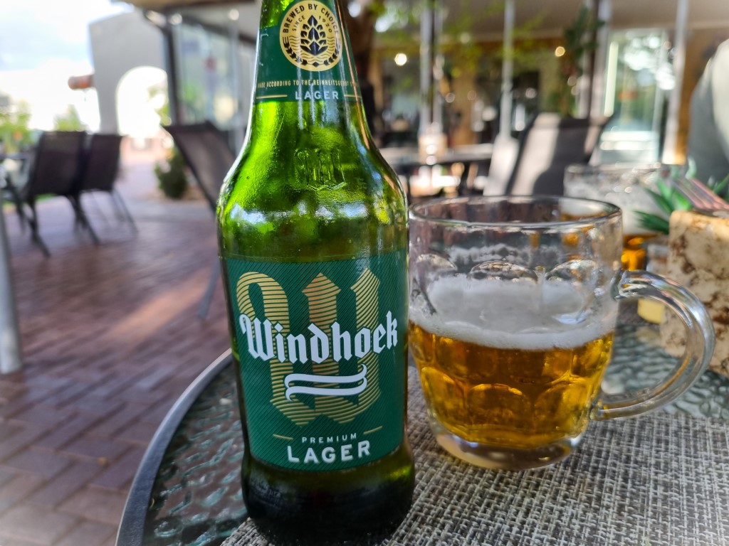 En iakttagelse är den fantastiska service man fick överallt i Namibia (och även Zimbabwe), här är enormt personaltätt och varje servitör behöver på sin höjd serva två-tre bord. Här levererades varma tallrikar till maten och kylda glas till ölen, och många presenterade sig med namn och förklarade sitt ansvar för att vara till tjänst under måltiden. Samma i butiker: personalen svabbar golv, väger upp varor och packar åt dig, och på bensinmacken: någon tankar åt dig medan en annan putsar vindrutan.