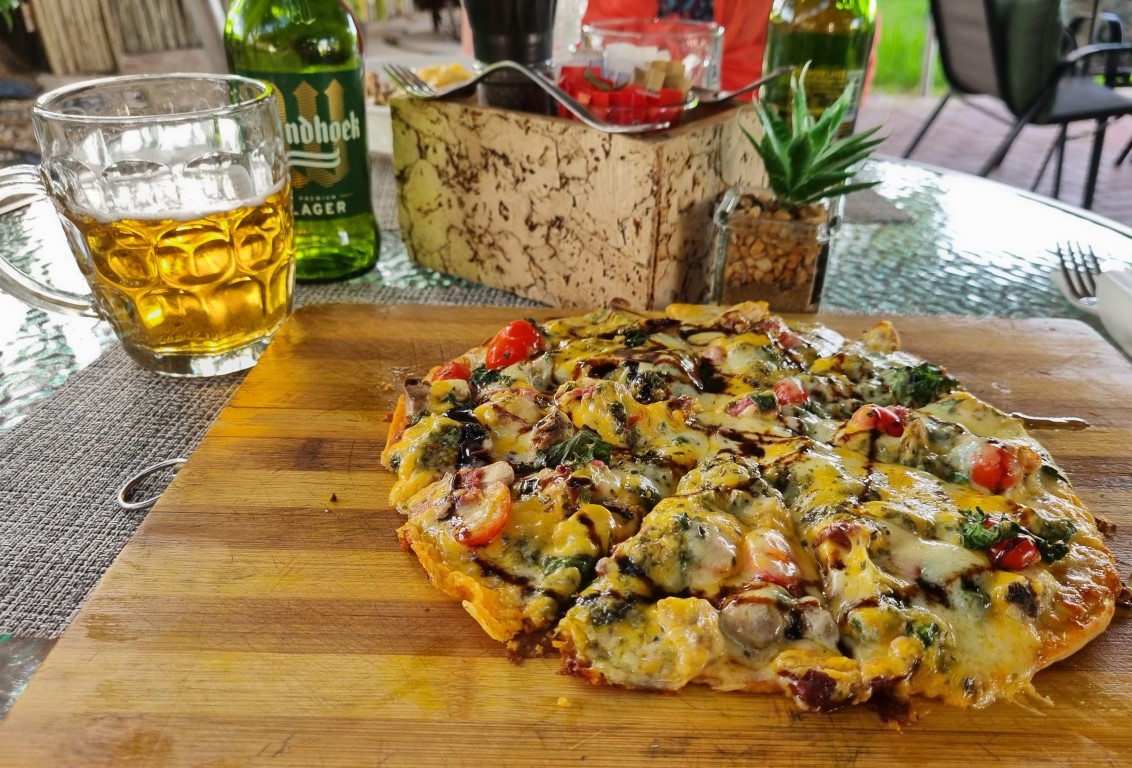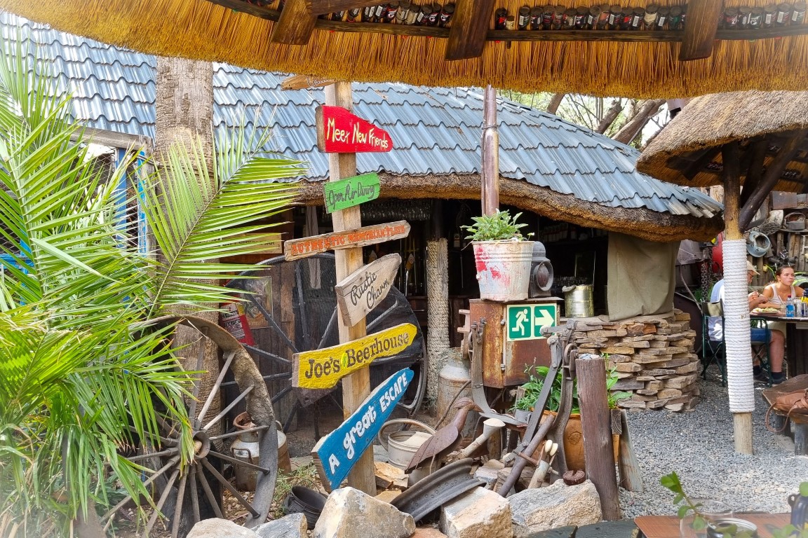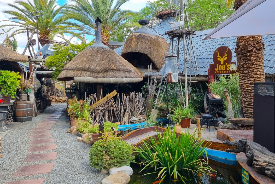 Jag skulle tro att alla turister i Windhoek någon gång besöker Joe’s Beerhouse, som verkligen sticker ut med sin speciella miljö. På menyn finns krokodil, zebra och allsköns exotiska hjortdjur, men vi låg lågt första dagen på plats och åt Fish & chips och burgare. Turistfälla? Nej, miljön är värt en hel del, servicen är bra och maten helt ok tyckte vi. Pris för drink, varmrätt och öl ca 200 kr per person.
