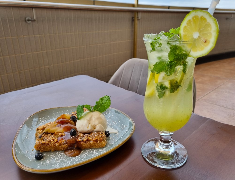 Cork & Fork var en annan restaurang på gångavstånd från vårt boende. Fin utemiljö här också med en gräsmatta där några gästande barn kunde springa av sig, men vi satt under det skuggande parasolltaket. Riktigt bra mat, och jag uppskattade deras små lustigheter i menyn: ”I’m on a seafood diet. I see food and I eat it”. Varmrätt, dessert och öl: cirka 170 kr per person.