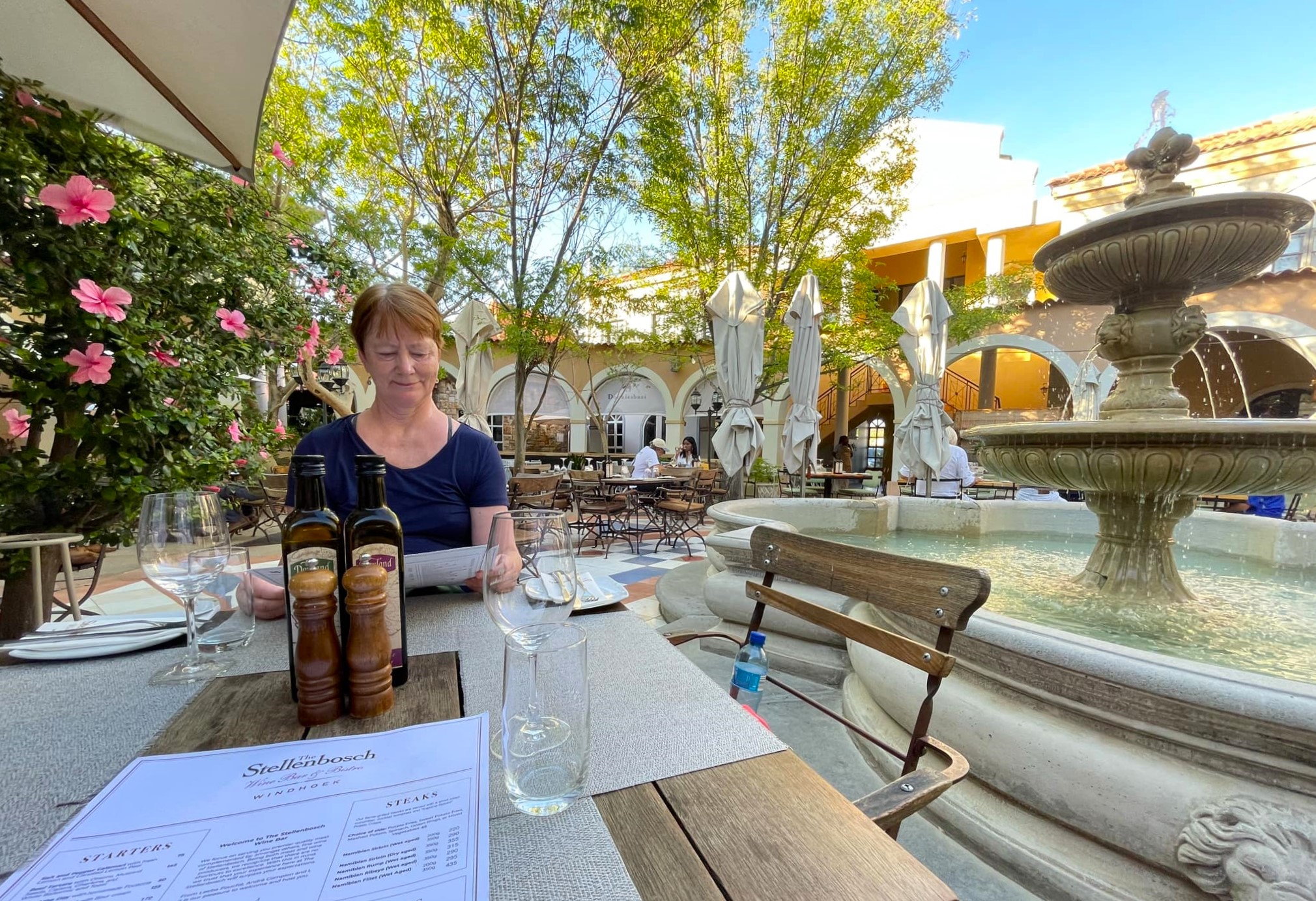 Stellenbosch Wine Bar & Bistro ligger lite österut i staden, i ett fint område som heter Klein Windhoek. En elegant miljö, innergård med springbrunn och blommande hibiskusar och hög klass på mat och vin: sydafrikanska viner som Stellenbosch såklart. Vi beställde förrätt, varmrätt, dessert, ett glas vin och ett dessertvin för under 350 kr per person, verkligen prisvärt.