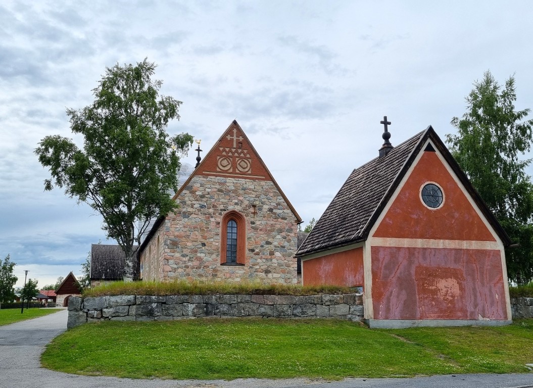 Kyrkan ska ha invigts 1492, och skottgluggar vittnar om att den även använts som befästning. Klocktornet kom till 1851, och var vid mitt besök täckt för renovering. Tekla berättar att kyrkan kan sägas vara indelad i tre tidsåldrar. I koret målningar från 1500-tal, troligen utförda av Albertus Pictor. Något bleka och skamfilade, då de varit överkalkade under perioden 1745 till 1909. Här finns också ett vackert altarskåp från 1520. I kyrkans mittendel befinner vi oss i 1700-tal; med den vackra predikstolen snidad av Nils Fluur 1712. Och slutligen den moderna delen med orgeln som invigdes 1971. Till de moderna attributen kan nu också räknas lekhörnan för besökande barn!