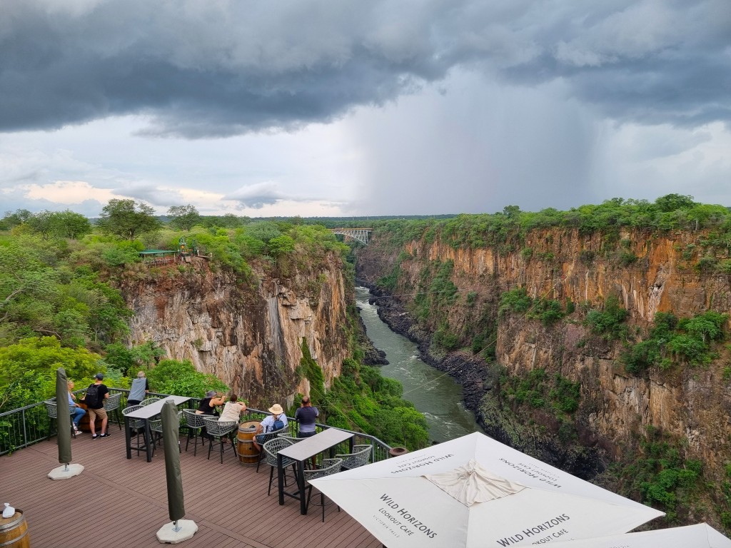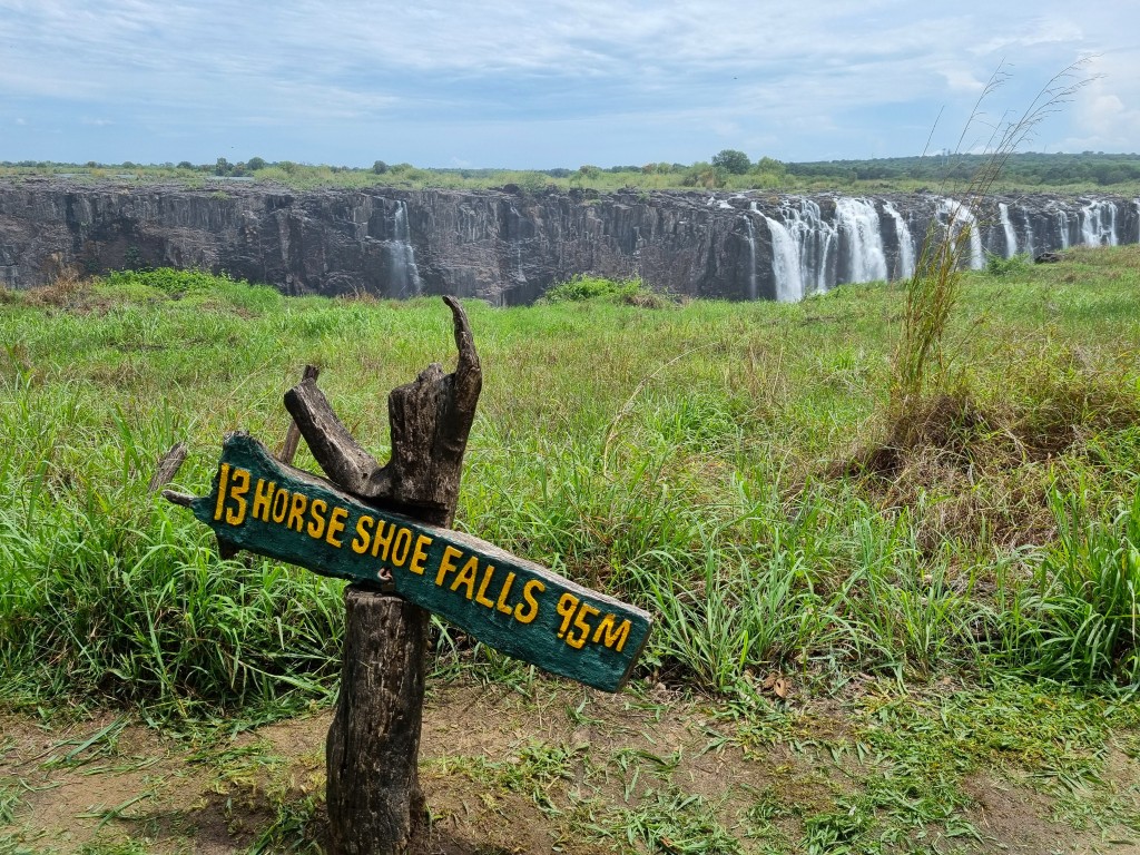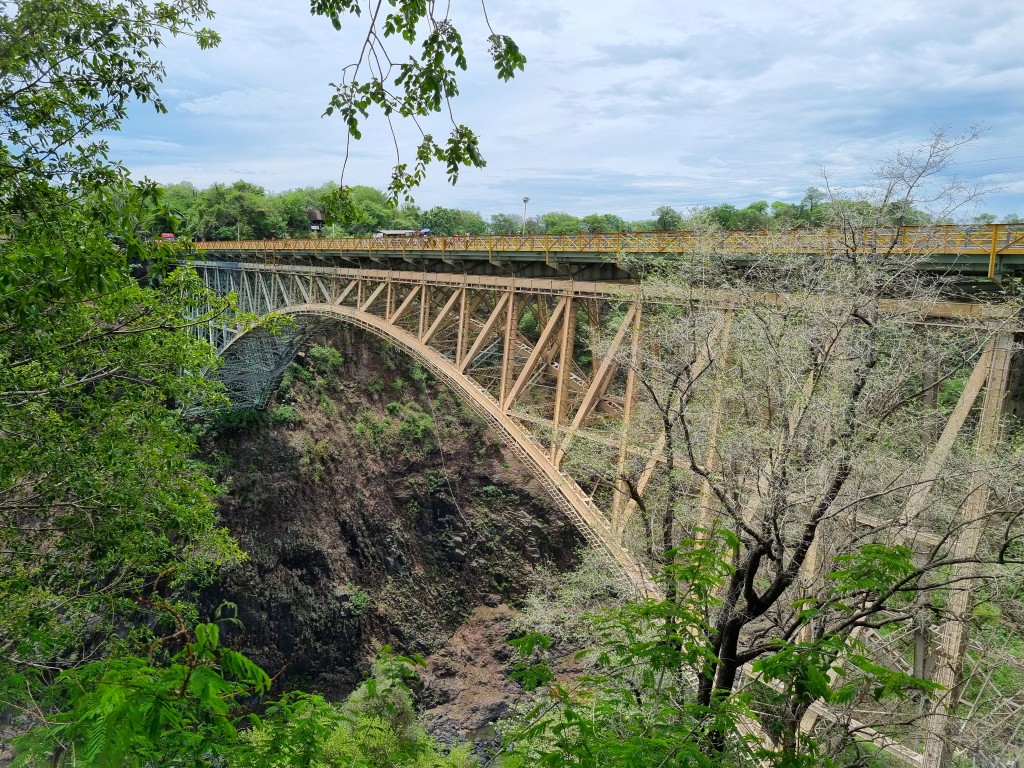De sista fallen heter Horseshoe falls, Rainbow Falls och Eastern Cataract, där den sistnämnda ligger efter ravinen där floden fortsätter, och tillhör därmed Zambia. Vid högvatten är rekommendationen att se fallen även från Zambias sida, men vi såg ingen anledning till det; flödet där var ganska blygsamt. Den sista utsiktsplatsen: nr 16 har en fin utsikt över den kombinerade bil- och tågbron från 1905 som går över Zambezifloden och förbinder Zimbabwe och Zambia. Just som vi tittade passade någon på att göra ett bungy-jump från bron. På vägen tillbaka blev det ännu en tur genom regnskog, innan vi var vid entrén.