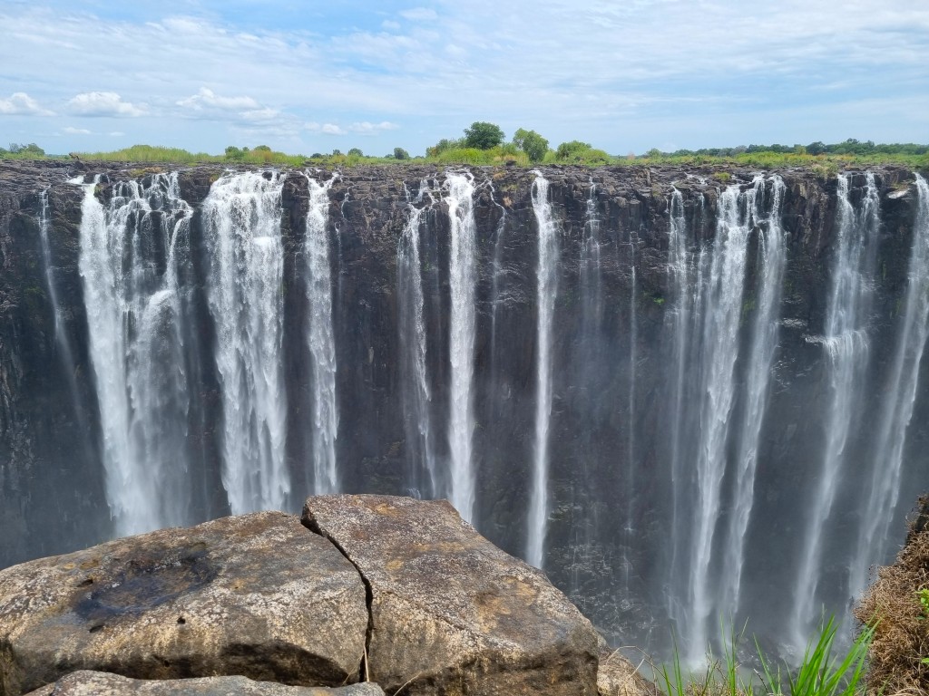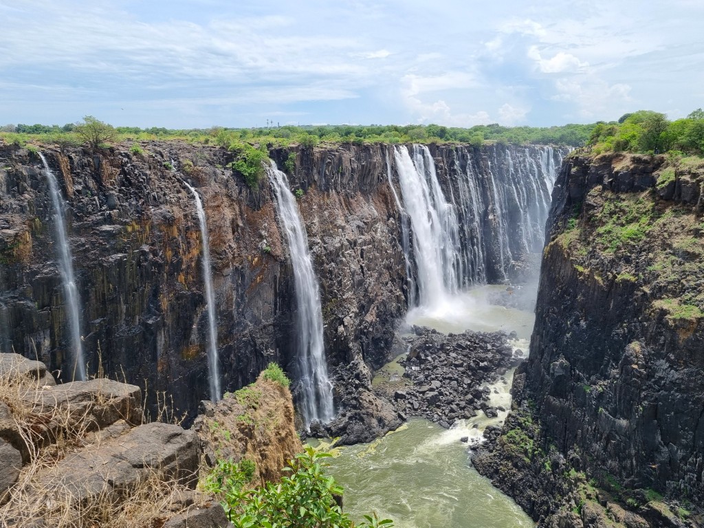 Victoriafallen lockade oss såklart – ett av världens största vattenfall och med på listan över världens sju naturliga underverk! Det där med störst är komplicerat, men om man räknar på en kombination av höjd och bredd så är ska det tydligen vara Victoriafallen som avgår med segern, före Iguazufallen och Niagarafallen.
